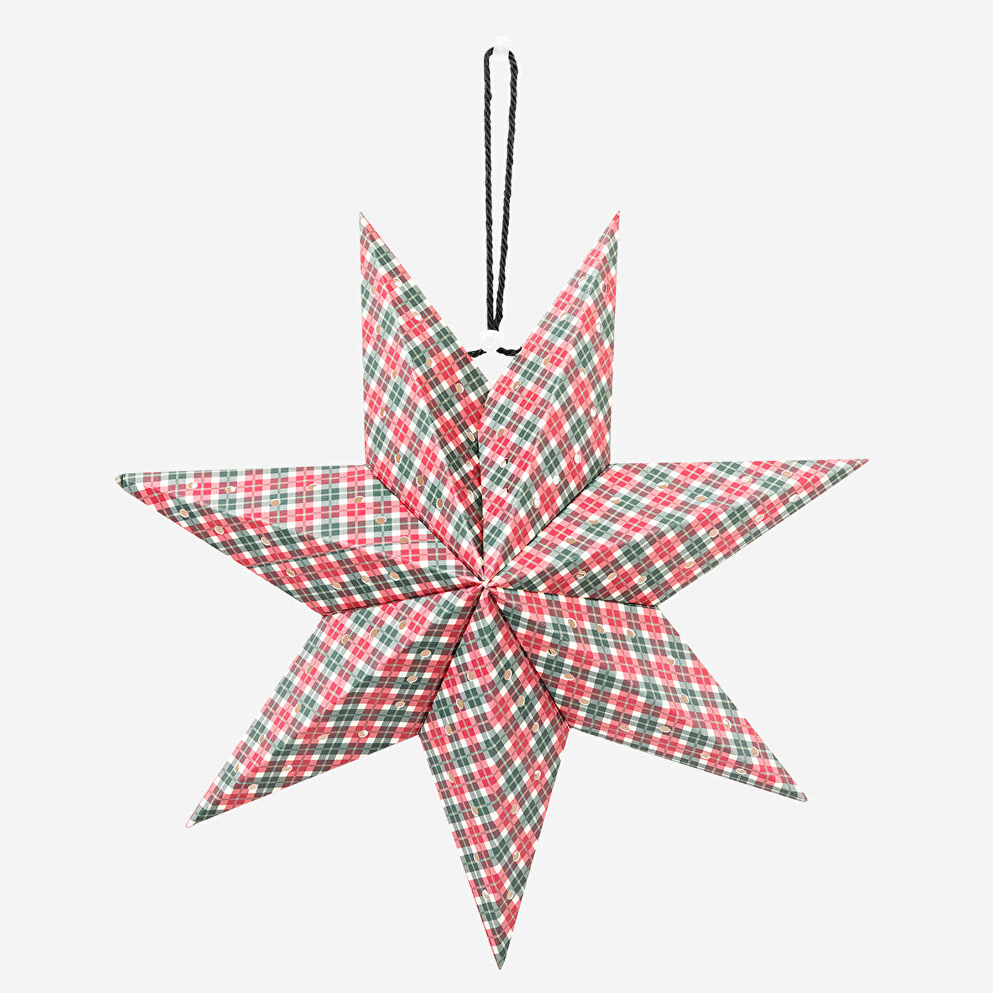 Askılı Dekoratif Yıldız 30 cm, cesur tasarımıyla Yılbaşı dekorasyonlarınıza enerji ve ışıltı katmak için mükemmeldir. 12 x 30 x 30 cm boyutlarındaki bu yıldız, canlı kareli desenleriyle hem geleneksel hem de modern iç mekan stillerine kolayca uyum sağlar. Kağıttan üretilmiş olması sayesinde hafif ve asması kolaydır, bu da onu pencerelere, duvarlara veya tavanlara yerleştirmek için ideal hale getirir. Geniş yüzey alanı sayesinde dikkat çekici bir merkez dekoru olarak öne çıkar, aynı zamanda diğer süslerle kombinlendiğinde dengeli bir şenlik atmosferi yaratır.