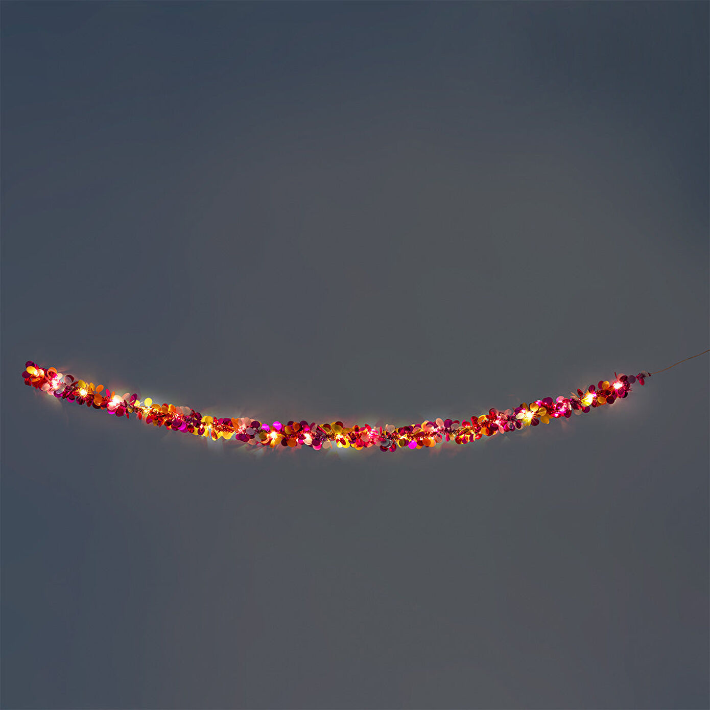 Çok Renkli Parıltılı LED Işık Zinciri, bulunduğu her ortama enerjik bir parlaklık ve neşeli bir atmosfer kazandırır. Canlı renklerdeki payetlerle süslenmiş bu ışık zinciri, esnek metal teli sayesinde aynaların, rafların, çerçevelerin ya da masa dekorlarının etrafına kolayca sarılabilir. 20 LED ampulden oluşan bu zincir, sıcak ve yumuşak bir aydınlatma sunarken, 3 x 1,2 x 7,5 cm boyutlarındaki payetler ışığı zarif bir şekilde yansıtarak göz alıcı bir parıltı oluşturur. Tatil süslemeleri, parti düzenlemeleri veya günlük dekorlar için ideal bir tamamlayıcıdır.