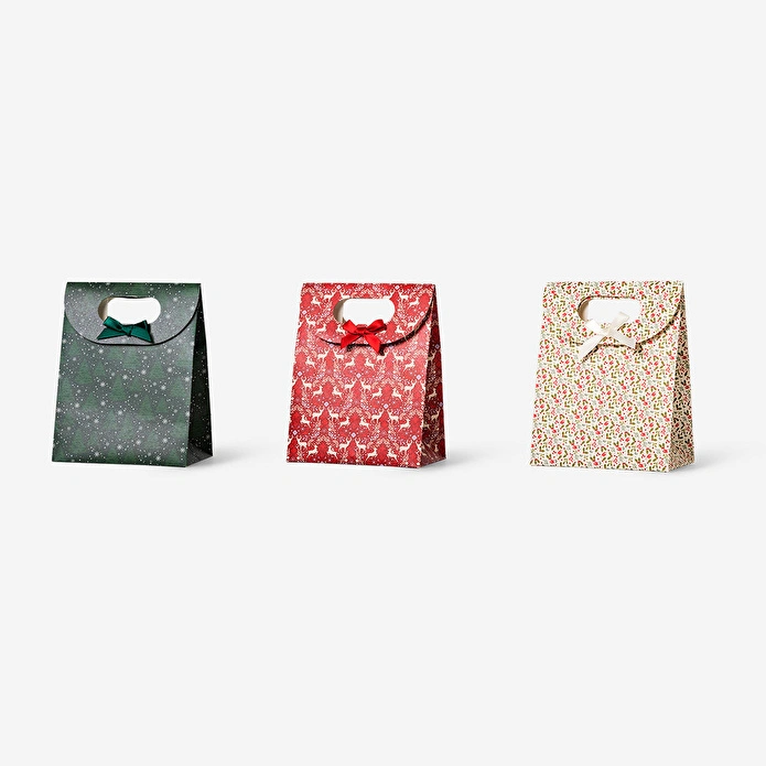 3'lü Küçük Desenli Hediye Çantası, her biri farklı yılbaşı temalı tasarıma sahip üç çantadan oluşan zarif ve pratik bir settir. 8,1 x 16,3 x 12,5 cm boyutlarındaki bu kompakt çantalar, tatlı ikramlar, küçük aksesuarlar veya yılbaşı sürprizleri gibi özel hediyeleri sunmak için mükemmeldir. Her bir çanta, canlı renkler ve mevsimsel desenlerle süslenmiş olup hediyelerinize sıcak ve neşeli bir hava katar. 1 kg’a kadar ağırlık taşıyabilen sağlam yapısı ve yerleşik sapları sayesinde hem şık hem de kullanışlı bir sunum sağlar.