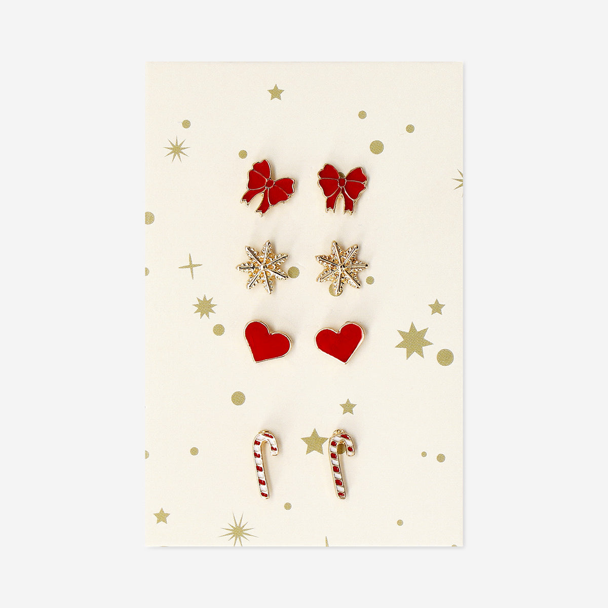 4'lü Yılbaşı Temalı Küpe, sezonun neşesini yansıtan zarif ve eğlenceli bir takı setidir. Kırmızı temalı tasarımlar arasında şeker kamışı, kalp, fiyonk ve yıldız motifleri yer alır; her biri parlak, çok renkli bir kaplama ile tamamlanmıştır. 1,3 x 1,2 x 0,5 cm boyutlarındaki şeker kamışı küpeler, görünümünüze tatlı bir ışıltı katarken, diğer tasarımlar farklı stillerle kombinlenerek çok yönlü bir kullanım sunar. Gündüzden geceye, parti veya günlük stil fark etmeksizin her kıyafete anında yeni yıl ruhu kazandırır.