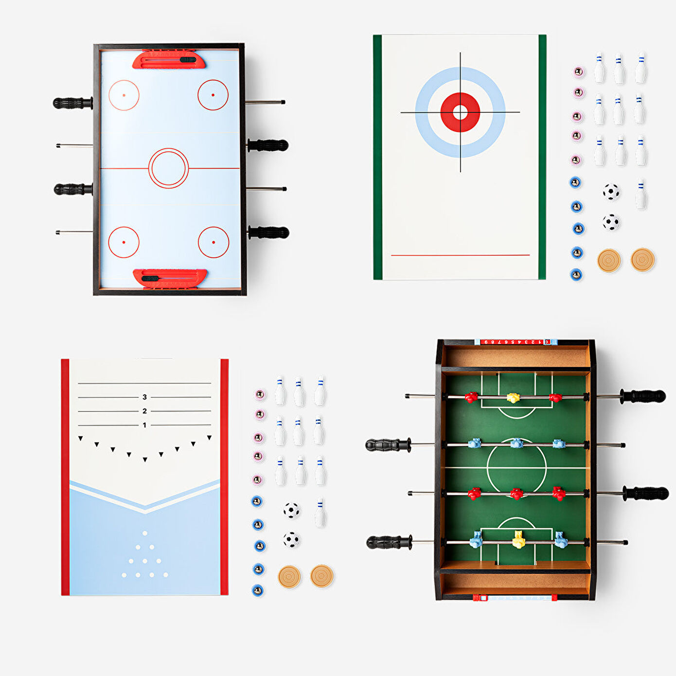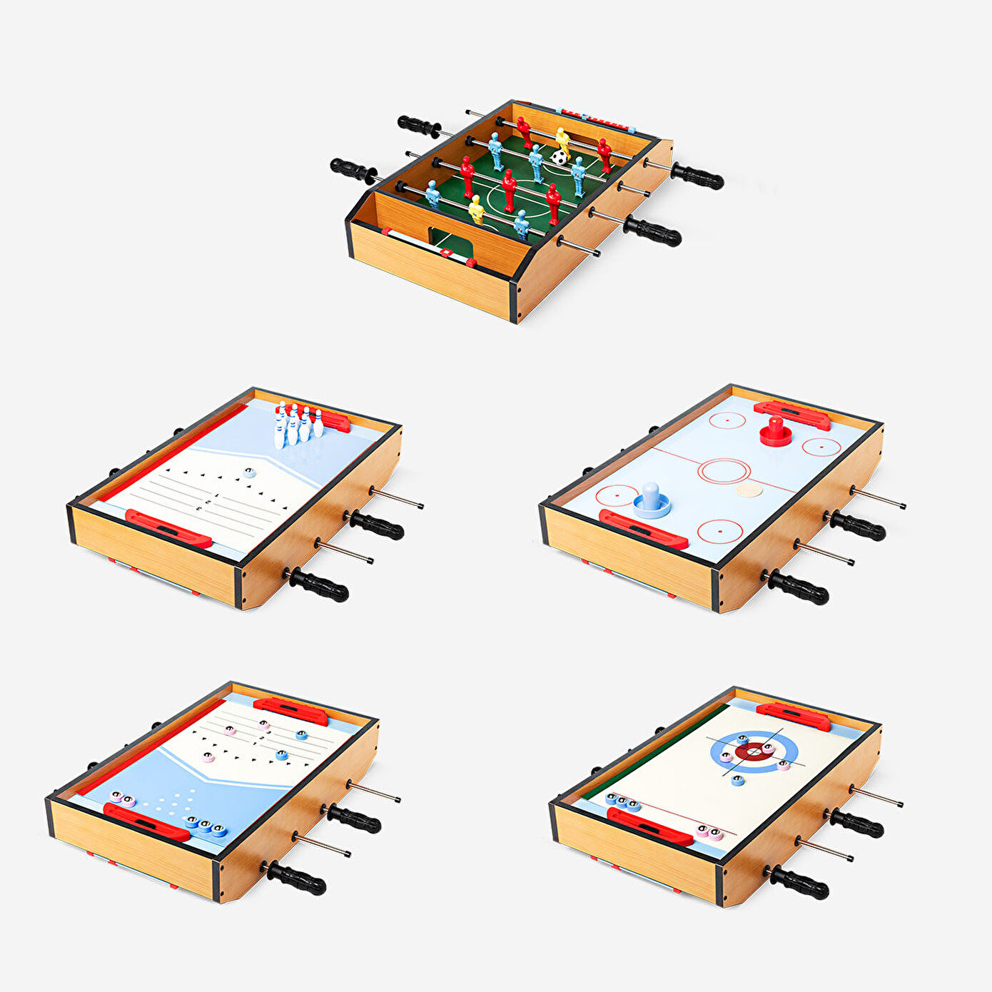 5'i Bir Arada Masa Oyunu Seti ile sonsuz eğlencenin tadını çıkarın. 51 x 9,5 x 31 cm ölçülerindeki bu çok renkli ahşap set, futbol, langırt, bowling, hava hokeyi ve curling gibi beş klasik oyunu bir arada sunar. Oyun tutkunları için mükemmel olan bu çok yönlü set, aile toplantıları, partiler veya dostça yarışmalar için idealdir. Kompakt tasarımı, kolay saklama ve kurulum sağlar, böylece her oyun odası için harika bir ek olur.
