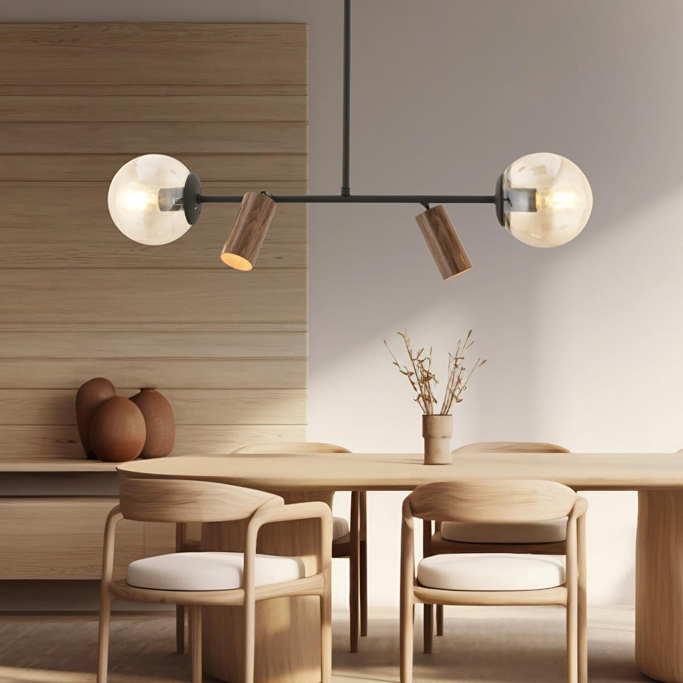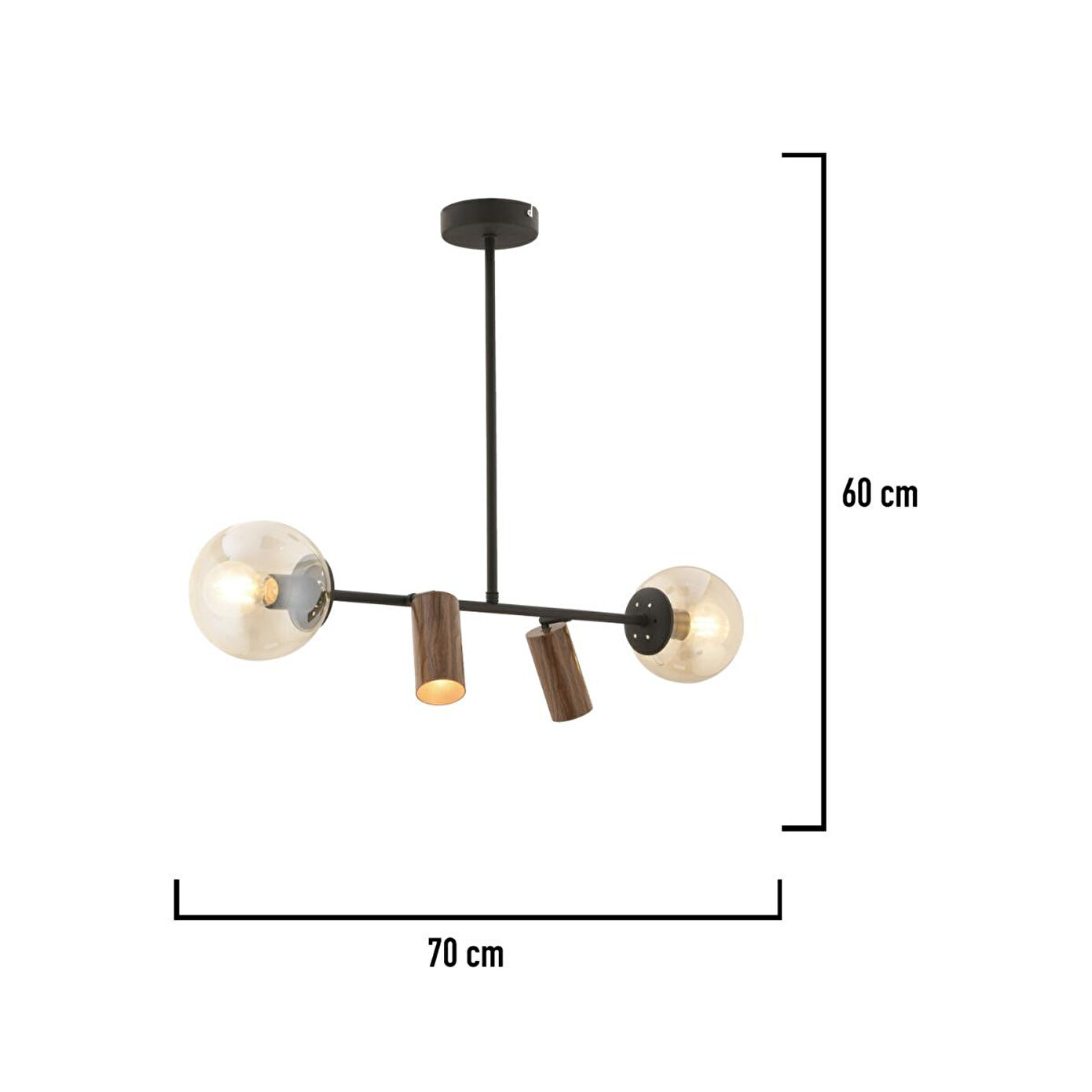Ürün Eni: 70 cm; Ürün Boyu: 60 cm; Materyal: Metal gövde; Başlıklar: Cam ve metal; Spot Başlık Duy Tipi: GU10; Cam Başlık Duy Tipi: E27; Renk: Siyah gövde, ahşap görünümlü spot detaylar; Ampul: Dahil değildir; Garanti: 2 yıl; Modern tasarımıyla dikkat çeken bu şık avize, metal gövdesi ve cam başlık detaylarıyla yaşam alanlarınıza hem estetik hem de fonksiyonellik katıyor. İki adet cam başlık ve iki adet ahşap görünümlü spot başlık sayesinde farklı ışık yönlendirmeleri yapabilir, mekanınıza hem genel hem odak aydınlatma sağlayabilirsiniz. Hem dekoratif hem de kullanışlı yapısıyla salon, mutfak ve oturma odaları için ideal bir seçimdir.