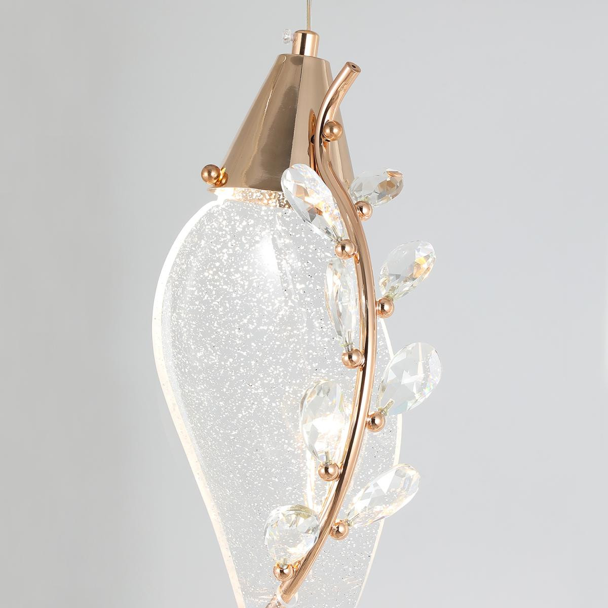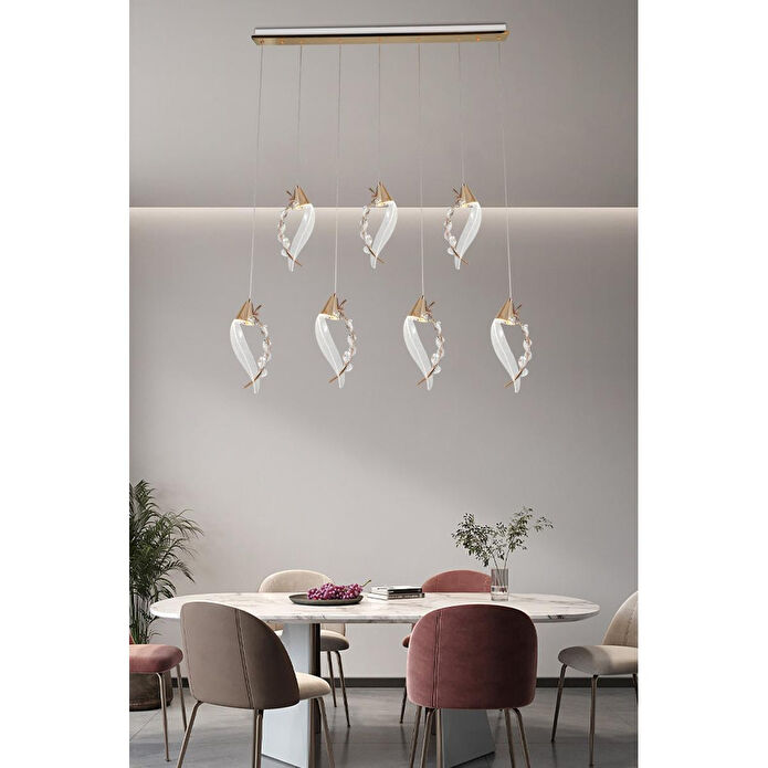 Hem modern hem de romantik bir tasarım çizgisine sahip bu gold çoklu LED sarkıt, ince kıvrımlı formları ve kristal dokulu dekoratif detaylarıyla mekâna sanatsal bir dokunuş kazandırır. 80 cm en ve 150 cm boy ölçülerine sahip geniş tasarımı sayesinde yemek masası, oturma alanı, merdiven boşlukları ve yüksek tavanlı mekanlarda kusursuz bir odak noktası oluşturur. Her bir sarkıt, Gold detaylarla tamamlanmış zarif bir gövde ve ışığı yumuşak şekilde kıran modern LED modüllerinden oluşur. Kıvrımlı şeffaf formlar ışığı etkileyici bir şekilde dağıtarak mekânda sıcak, hoş ve göz yormayan bir aydınlık sağlar.