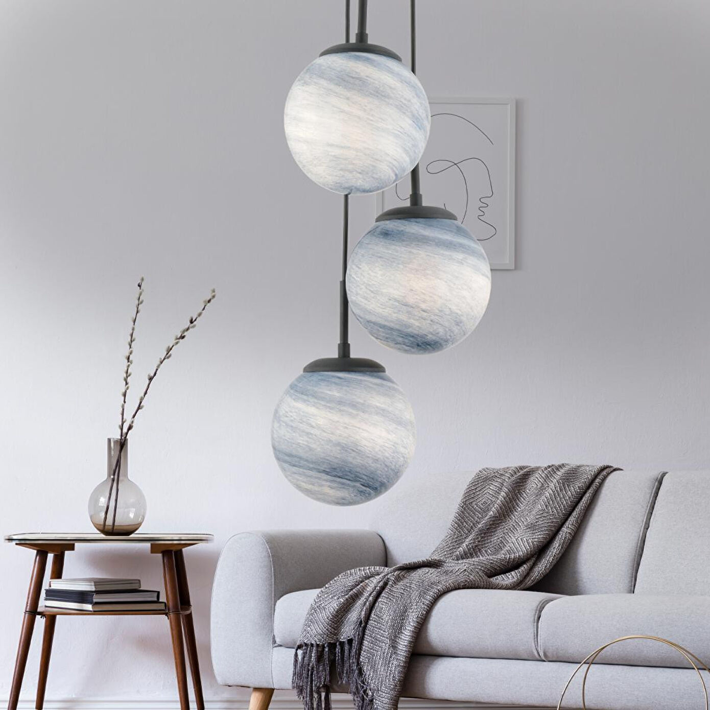 Modern ve estetik tasarımıyla yaşam alanlarınıza farklı bir atmosfer katacak bu şık 3’lü sarkıt avize, mavi-beyaz alacalı cam küreleriyle göz kamaştırıyor.; Siyah metal gövdesi ile dayanıklılık sunarken, zarif renk geçişli cam detayları ortama sofistike bir dokunuş katar.; Ürün Özellikleri; Ürün Ölçüleri: En 15 cm; Boy 75 cm; Materyal: Gövde metal, cam detaylı; Renk: Siyah gövde, mavi-beyaz alacalı cam küreler; Duy Tipi: E-27; Ampul: Dahil değildir; Boy: Ayarlanabilir; Garanti: 2 yıl garantilidir