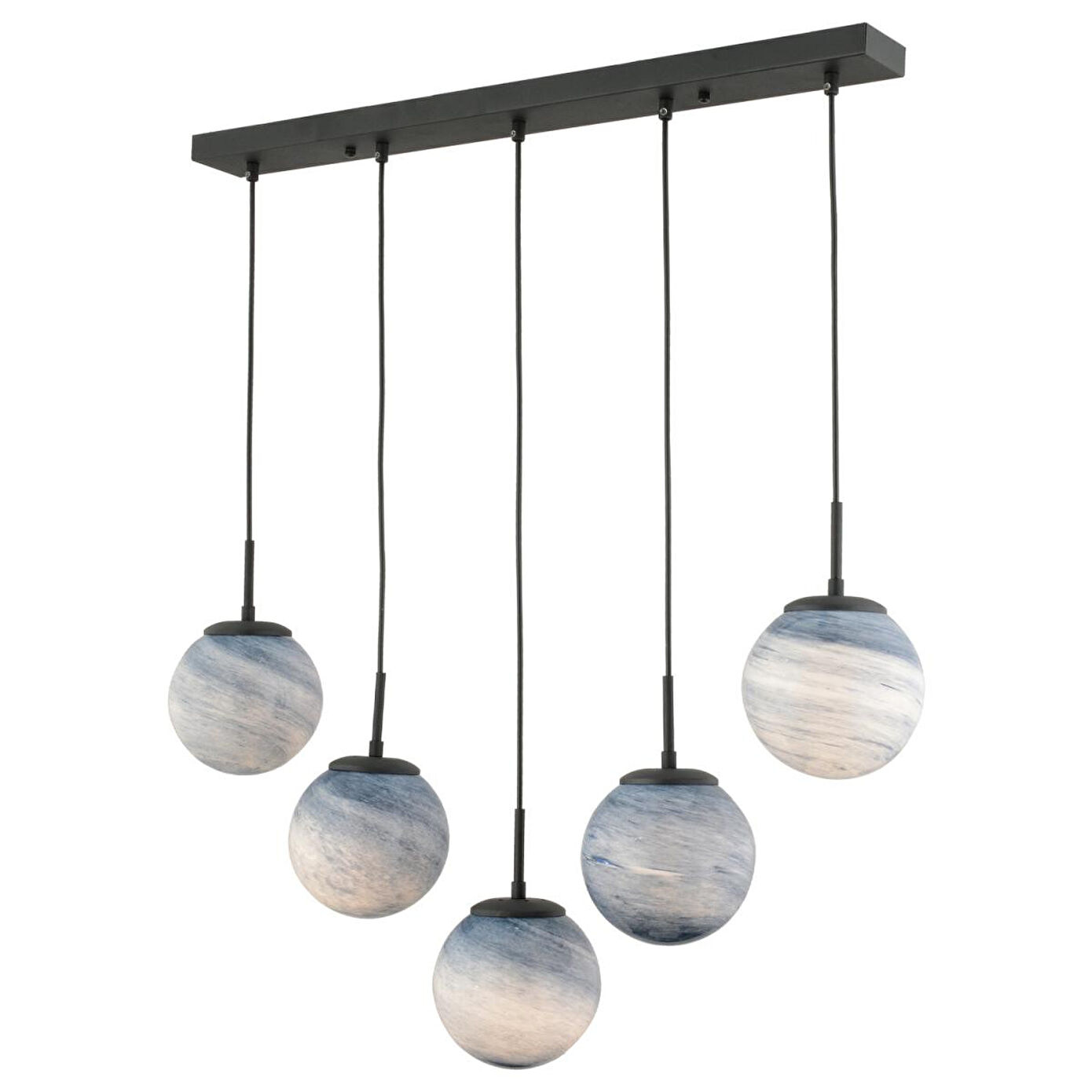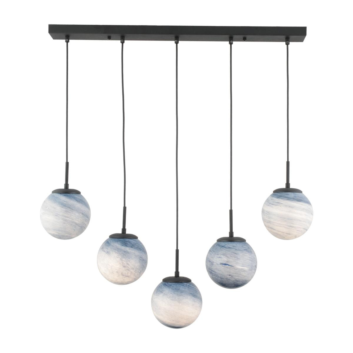 Modern ve estetik tasarımıyla yaşam alanlarınıza farklı bir atmosfer katacak bu şık5'li sarkıt avize, mavi-beyaz alacalı cam küreleriyle göz kamaştırıyor.; Siyah metal gövdesi ile dayanıklılık sunarken, zarif renk geçişli cam detayları ortama sofistike bir dokunuş katar.; Ürün Özellikleri; Ürün Ölçüleri: En 76 cm, Boy 85cm; Materyal: Gövde metal, cam detaylı; Renk: Siyah gövde, mavi-beyaz alacalı cam küreler; Duy Tipi: E-27; Ampul: Dahil değildir; Boy: Ayarlanabilir; Garanti: 2 yıl garantilidir