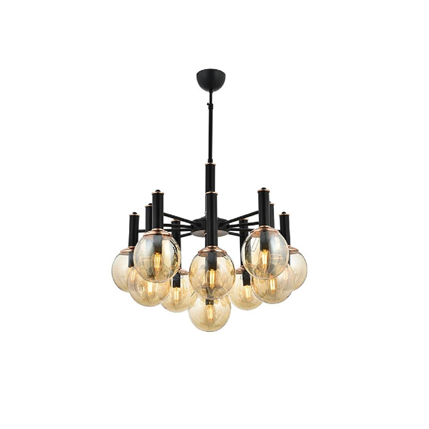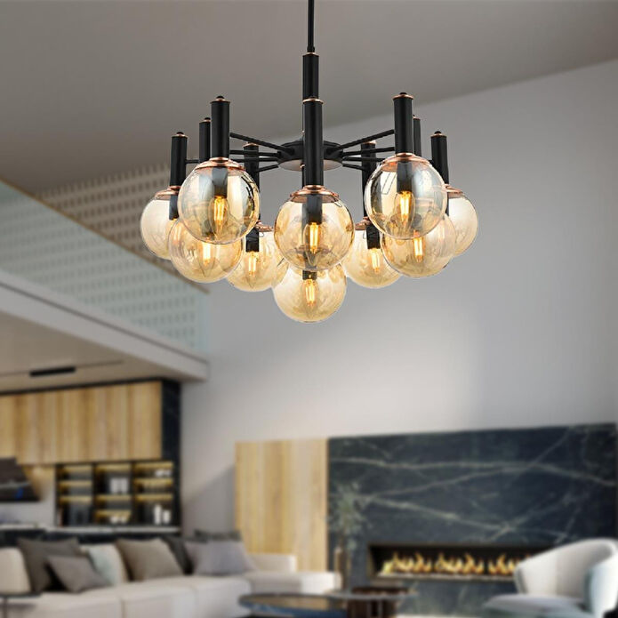 Yaşam alanınıza zarafet katacak modern bir aydınlatma mı arıyorsunuz? Bu siyah-bakır detaylı avize, göz alıcı cam başlıklarıyla ışığı eşit ve estetik biçimde dağıtarak evinize sıcak bir atmosfer kazandırır. Ürün Özellikleri; En: 85 cm; Boy: 70 cm (ayarlanabilir); Renk: Siyah-Bakır; Materyal: Metal;; Başlık: Cam; Duy Tipi: E-14; Ampul: Dahil değil; Garanti: 2 Yıl