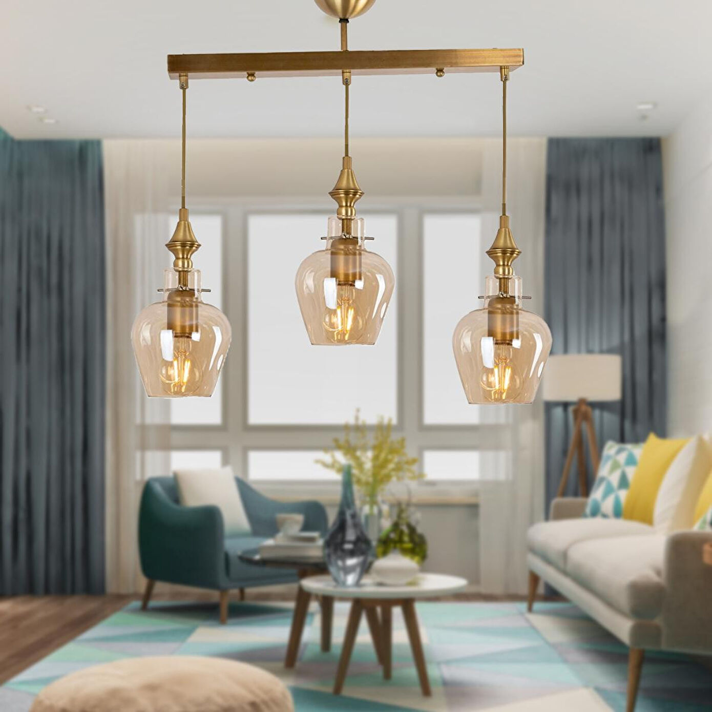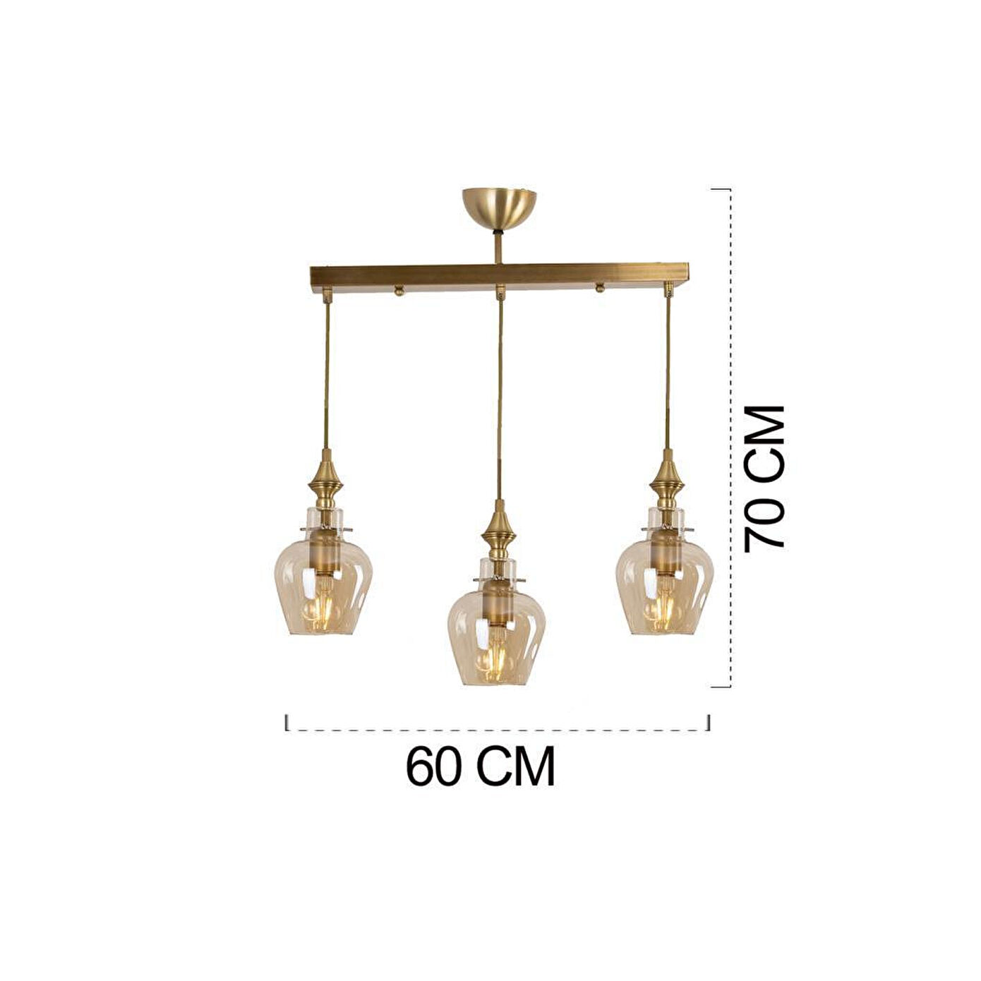 Salon, oturma odası, yemek alanı veya mutfak gibi birçok yaşam alanında kullanılabilecek bu 3’lü sarkıt avize, dekorasyonunuza şıklık katmak için ideal bir seçimdir. Cam başlıkların ışığı yumuşatarak yayması, ortamda daha sıcak ve davetkâr bir ambiyans oluşturur. Ayarlanabilir boy özelliği ile dilediğiniz yükseklikte kullanabilir, mekanınıza en uygun aydınlatmayı sağlayabilirsiniz. Ürün Özellikleri; En: 55 cm; Boy: 70 cm (boy ayarlanabilir); Renk: Eskitme; Materyal: Metal; Başlıklar: Cam; Duy Tipi: E-27; Ampul: Dahil değildir; Montaj: Demonte gönderilir; Garanti: 2 Yıl