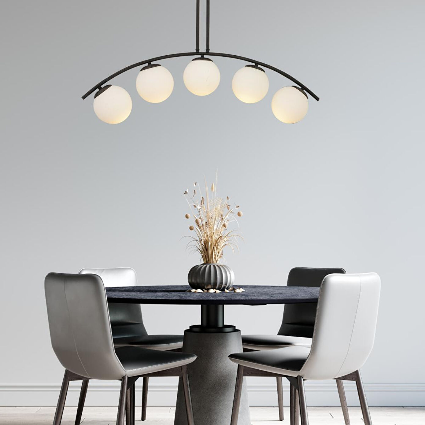 Modern ve şık tasarımıyla yaşam alanlarınıza zarafet katan bu avize, geniş ölçüleri sayesinde özellikle salon, oturma odası ve yemek odalarında mükemmel bir aydınlatma sağlar. Siyah metal gövdesi ve cam başlıklarıyla estetik görünümünü ön plana çıkarırken, dayanıklı yapısı uzun yıllar güvenle kullanım imkânı sunar. Ürün Özellikleri; En: 100 cm; Boy: 60 cm; Renk: Siyah; Materyal: Metal; Başlıklar: Cam; Boy Ölçüsü: Sabit; Duy Tipi: E-27; Ampuller: Dahil değildir; Montaj: Demonte gönderilmektedir Garanti: 2 yıl garantilidir