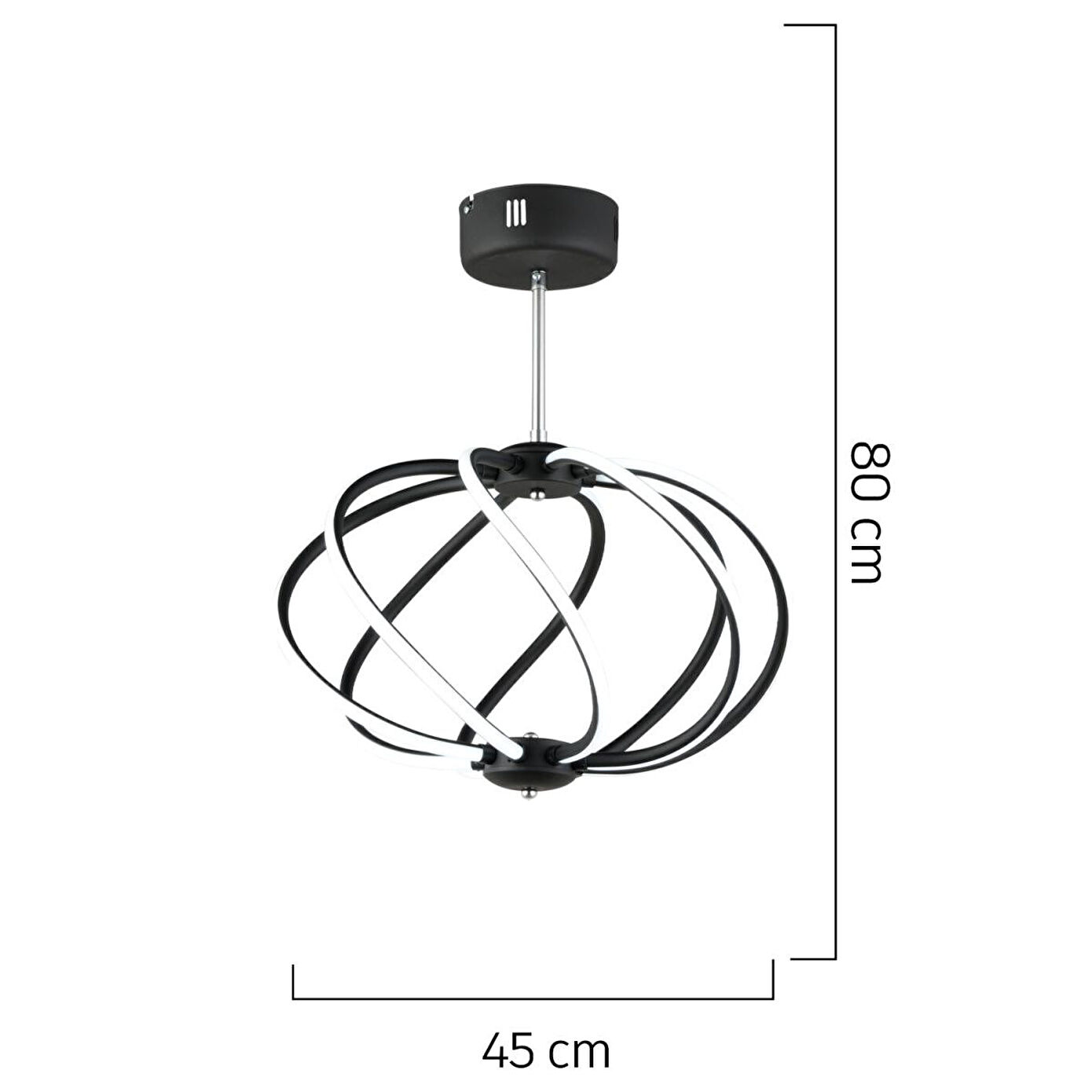 Modern tasarımıyla yaşam alanlarınıza zarafet ve güçlü bir aydınlatma katan krom LED avize, dekorasyonda şıklık arayanlar için mükemmel bir seçimdir. 88 Watt gücündeki LED sistemi sayesinde enerji tasarruflu, uzun ömürlü ve parlak bir ışık sunar. Ürün Özellikleri; Ürün En: 45 cm; Boy: 80 cm; Aydınlatma Türü: LED aydınlatmalı; Güç: 88 Watt; Renk: Siyah Materyal: Metal; Boy Ölçüsü: Sabit; Kumanda: Yok; Garanti: 2 Yıl
