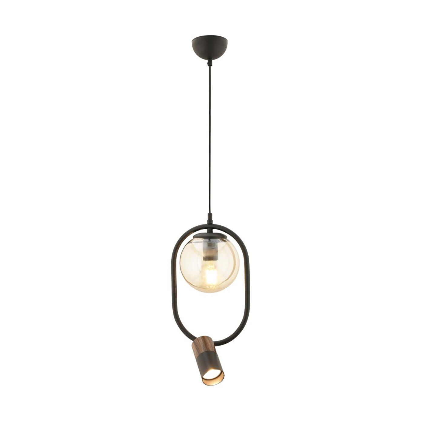Ürün En: 20 cm; Ürün Boy: 80 cm; Materyal: Metal gövde, cam ve metal başlıklar; Spot başlık duy tipi: GU10; Cam başlık duy tipi: E27; Renk: Siyah; Ampuller dahil değildir; 2 yıl garantilidir; Modern tasarımıyla dikkat çeken bu avize, metal gövde üzerine yerleştirilmiş cam ve spot başlık kombinasyonu ile yaşam alanlarınıza hem estetik hem de işlevsellik katar. Siyah gövdesi, ahşap detaylı spot başlığı ve şık cam küre başlığıyla zarif bir görünüm sunar. Farklı yönlere ışık yayabilen spot başlığı, dekoratif cam başlık ile birlikte hem odak hem de ortam aydınlatması sağlar.