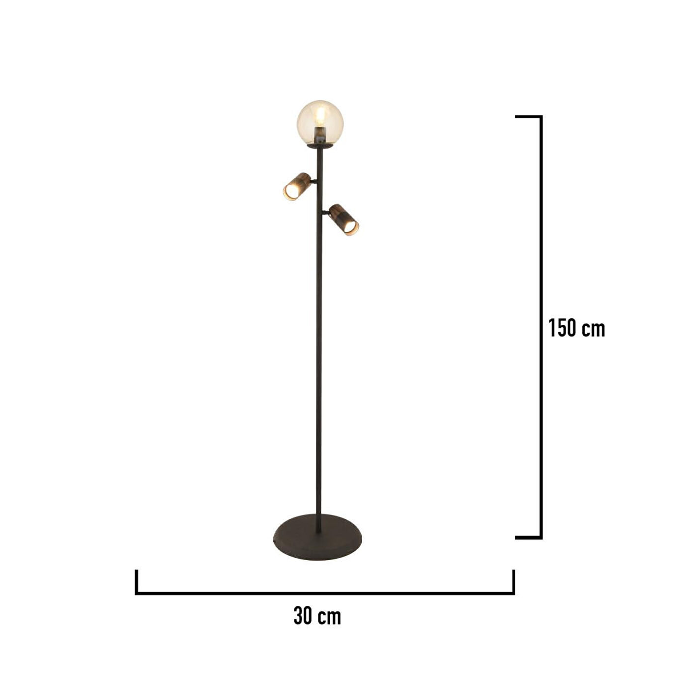 En: 30 cm; Boy: 150 cm; Materyal: Metal; Başlıklar: Cam ve metal; Spot başlık duy tipi: GU10; Cam başlık duy tipi: E27; Renk: Siyah; Ampuller dahil değildir; 2 yıl garantilidir; Modern tasarım ile işlevselliği bir araya getiren bu şık lambader, hem genel aydınlatma hem de odak ışık için ideal bir çözümdür. Üstteki cam başlık yumuşak ve geniş bir ışık yayarken, iki adet ayarlanabilir spot başlık ile istediğiniz alanı vurgulayabilirsiniz. Metal gövdesi ve siyah rengi ile her dekorasyona uyum sağlar. Hem salon, hem çalışma alanı hem de okuma köşelerinde tarzınızı tamamlayacak bir aydınlatma seçeneğidir.