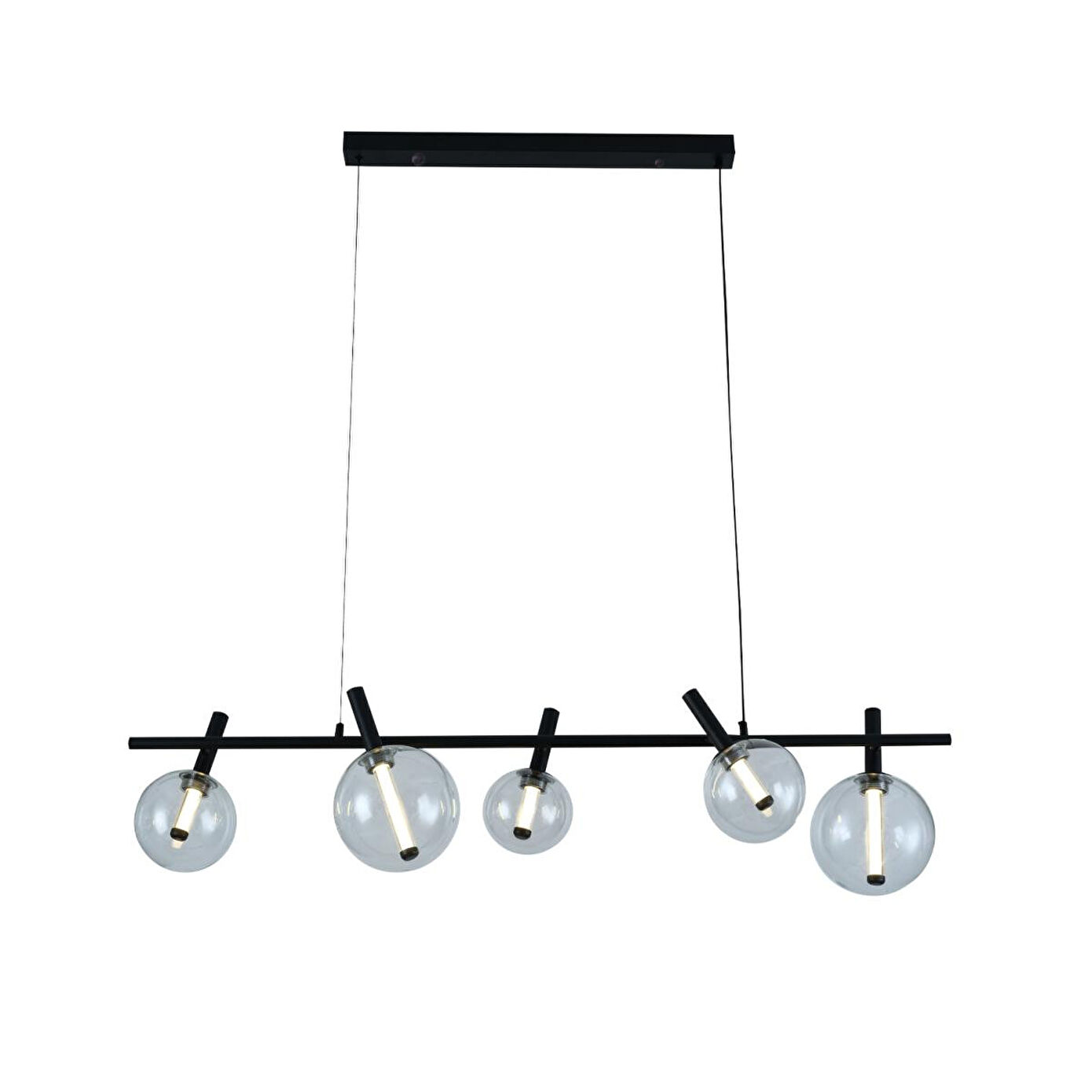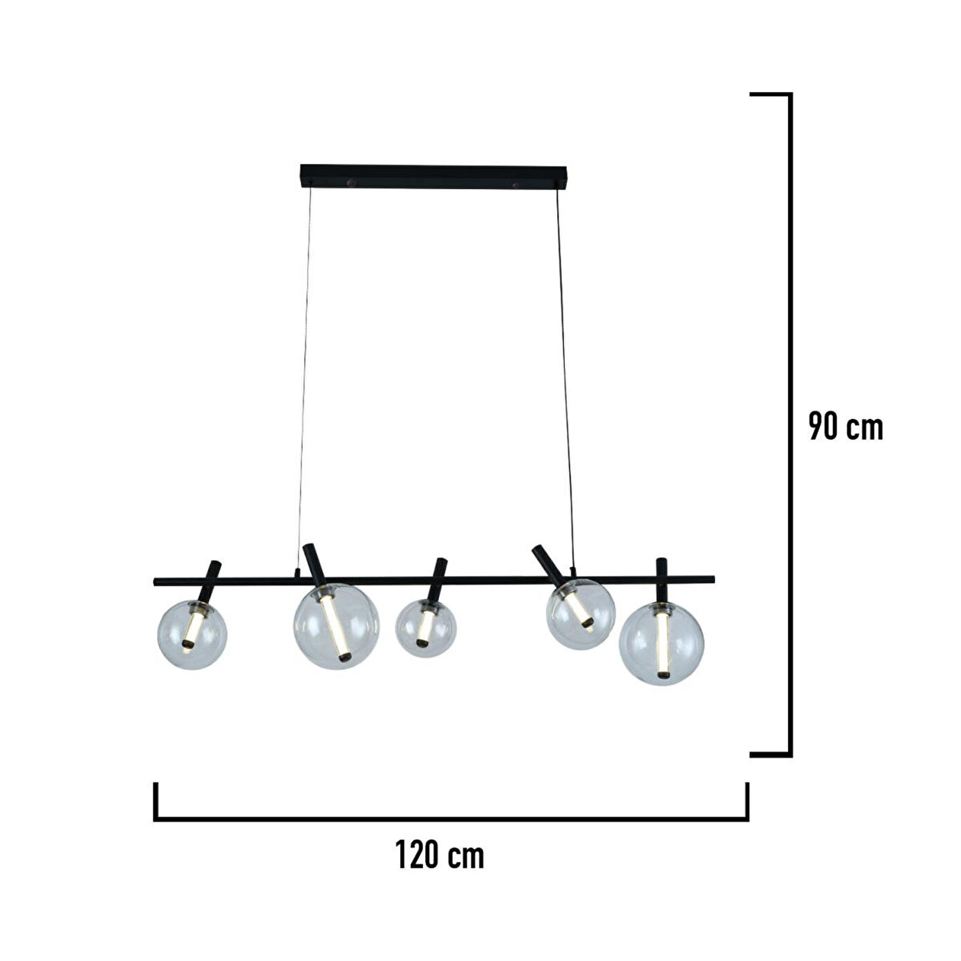 Yüksek kaliteli metal gövde ve zarif cam başlıklar ile üretilen bu avize, 7 Watt LED aydınlatmasıyla hem enerji tasarrufu sağlar hem de uzun ömürlü kullanım sunar. Minimalist siyah gövde, camın şeffaf zarafeti ve altın detaylar ile birleşerek ortamınıza lüks bir hava katar. Ürün Özellikleri; Genişlik: 120 cm; Yükseklik: 80 cm (Boy ayarlanabilir); Renk: Siyah gövde, cam başlıklar; Materyal: Metal gövde & cam başlıklar; Aydınlatma: LED aydınlatma (7 Watt); Kumanda: Yok; Garanti: 2 yıl
