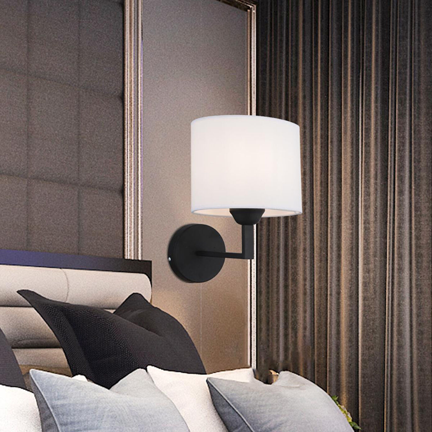 Evinizin veya iş yerinizin duvarlarına şıklık katmak istiyorsanız, bu modern siyah gövdeli ve beyaz kumaş başlıklı duvar aplik tam size göre! Sade tasarımı sayesinde her dekorasyon tarzına kolayca uyum sağlar. Yumuşak ışık dağılımı ile ortamınıza sıcaklık ve huzur katar. Ölçüler: En 28 cm, Boy 39 cm; Materyal: Dayanıklı metal gövde; Renk: siyah Başlık: Beyaz kumaş abajur; Duy Tipi: E-27 (standart ampul uyumludur); Ampul: Dahil değildir (isteğe göre LED, tasarruflu ya da dekoratif ampuller kullanılabilir); Enerji Kullanımı: Pilli değildir, elektrik bağlantısı ile çalışır; Garanti: 2 yıl
