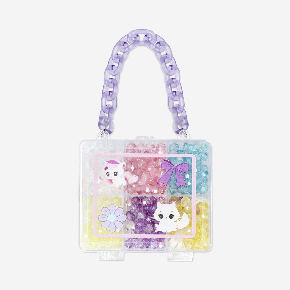 Kutu, sevimli hayvan desenleriyle süslenmiştir ve içindeki şeffaf bölmeler sayesinde tüm malzemeleri düzenli bir şekilde saklamanı sağlar. 8,9 x 3 x 10,9 cm boyutundaki kompakt tasarımıyla kolayca taşınabilir — ister evde, ister arkadaş buluşmalarında ya da seyahatte yaratıcılığını ortaya çıkarabilirsin.