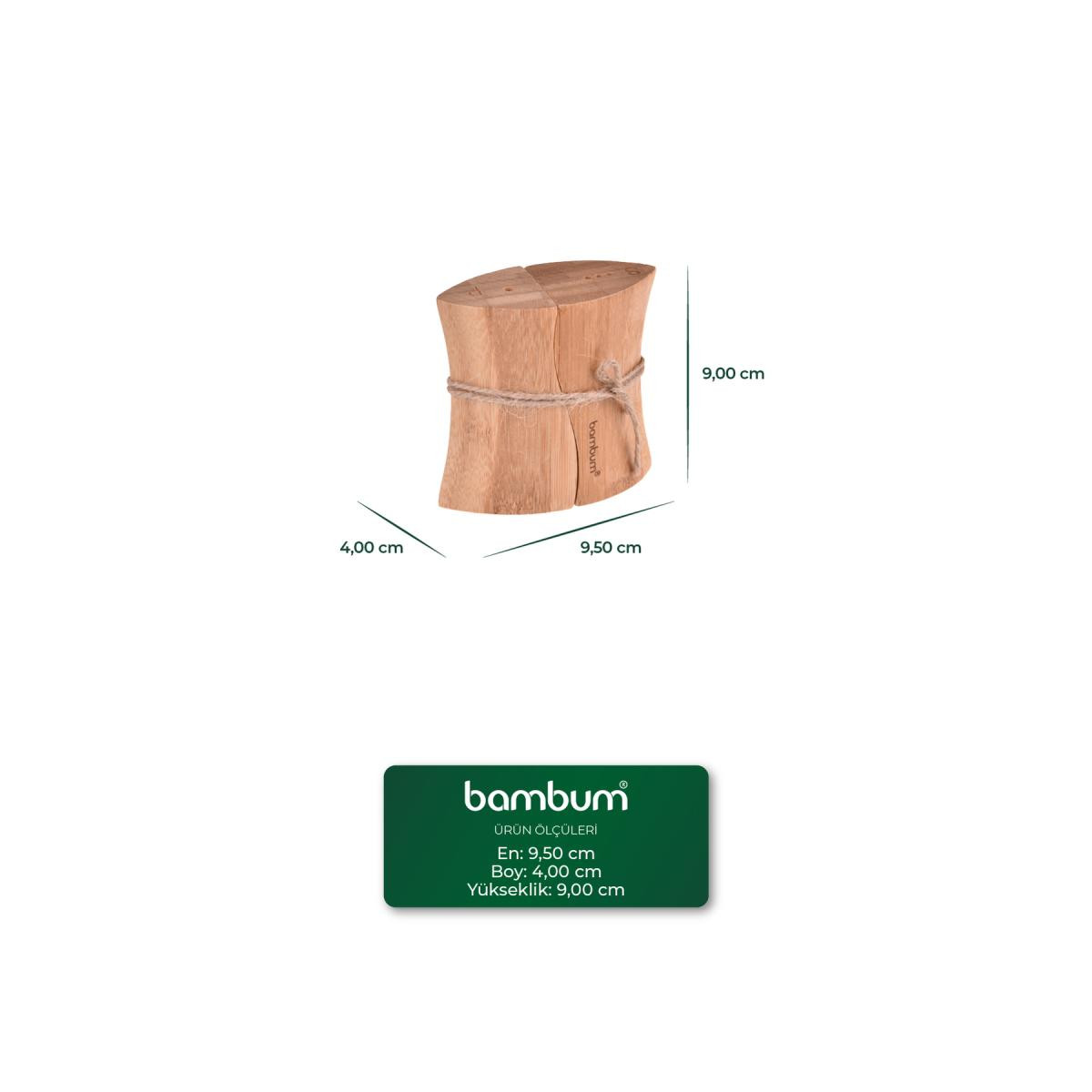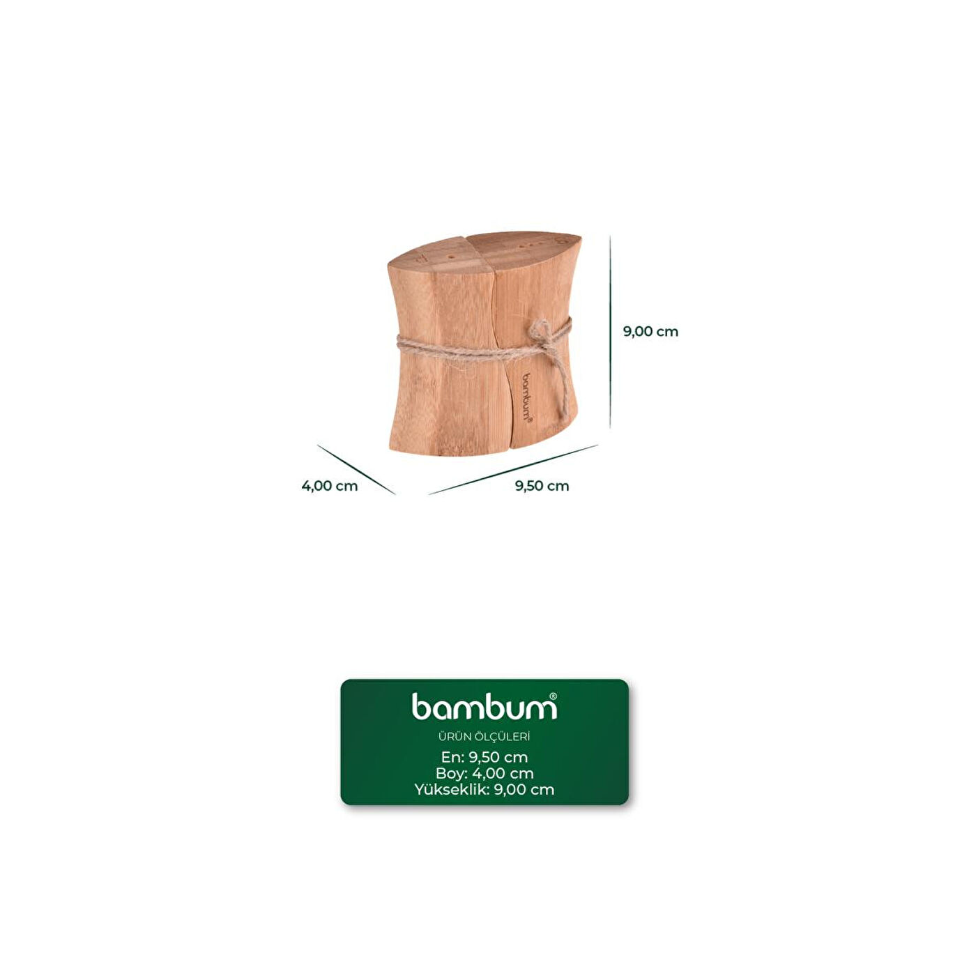 Nunna Tuzluk & Biberlik.; Paket içeriği: 1 adet tuzluk ve 1 adet biberlik bulunur.; Ürün ölçüleri: Birlikte konumlandırıldığında toplam ölçü 9,5 × 4 × 9 cm’dir.; Ürün hacmi: Tuz, karabiber ve benzeri baharatlar için ideal kullanım sunar.; Ürün malzemesi: %100 doğal bambu malzemeden üretilmiştir.; Ürün rengi: Doğal bambu tonlarında sade ve modern bir görünüme sahiptir.; Kullanım alanları: Sofra düzeni, mutfak tezgâhı ve misafir ikramlarında kullanılabilir.; Temizleme talimatları: Nemli bir bezle silinerek temizlenmelidir.; Kullanılmaması gereken alanlar: Bulaşık makinesi, mikrodalga ve fırında kullanılmamalıdır.; Ek bilgi: Ürünler birbirinin içine geçerek bütün bir form oluşturur ve dekoratif bir görünüm sağlar.