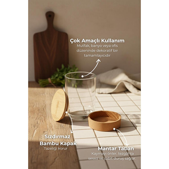 Bambum Corki – Mantar Altlıklı Cam Saklama Kabı 900 ml | Doğal ve Fonksiyonel Saklama Çözümü Bambum Corki 900 ml, doğal mantar altlığı ve şeffaf cam gövdesiyle mutfakta hem sağlıklı hem de estetik bir saklama deneyimi sunar.; Gıda ürünlerinizi taze ve hijyenik bir şekilde muhafaza etmenizi sağlayan bu özel tasarım, doğaya duyarlı kullanıcılar için ideal bir seçimdir.; Ürün Özellikleri: Kapasite: 900 ml Malzeme: Sağlıklı cam + doğal mantar altlık Kapak: Sıkı oturan, hava geçirmez özellikte Kullanım Alanı: Kuruyemiş, kahve, şeker, baharat ve atıştırmalıklar için ideal Temizlik: Cam kısım elde veya bulaşık makinesinde yıkanabilir; mantar altlık sadece nemli bezle silinmelidir Ürün Ölçüleri: En: 9,6 cm Boy: 9,6 cm Yükseklik: 13 cm Doğal Tasarım ile Şık Sunum Çevre dostu mantar altlığı ile kayma yapmaz, yüzeyleri korur Şeffaf cam sayesinde içerikler kolayca görülebilir Modern ve doğal görünümüyle her mutfak stiline uyum sağlar Nerelerde Kullanılır? Çay, kahve, şeker, kuru meyve veya bakliyat gibi ürünlerin hijyenik saklanmasında Ofiste masa üstü düzenleyici olarak Dekoratif sunumlar için servis ürünleriyle kombinlenerek Anahtar Kelimeler: bambum corki, mantar altlıklı cam kavanoz, 900 ml cam saklama kabı, doğal cam kavanoz, mutfak saklama ürünleri, sağlıklı gıda muhafaza, şık cam kavanoz