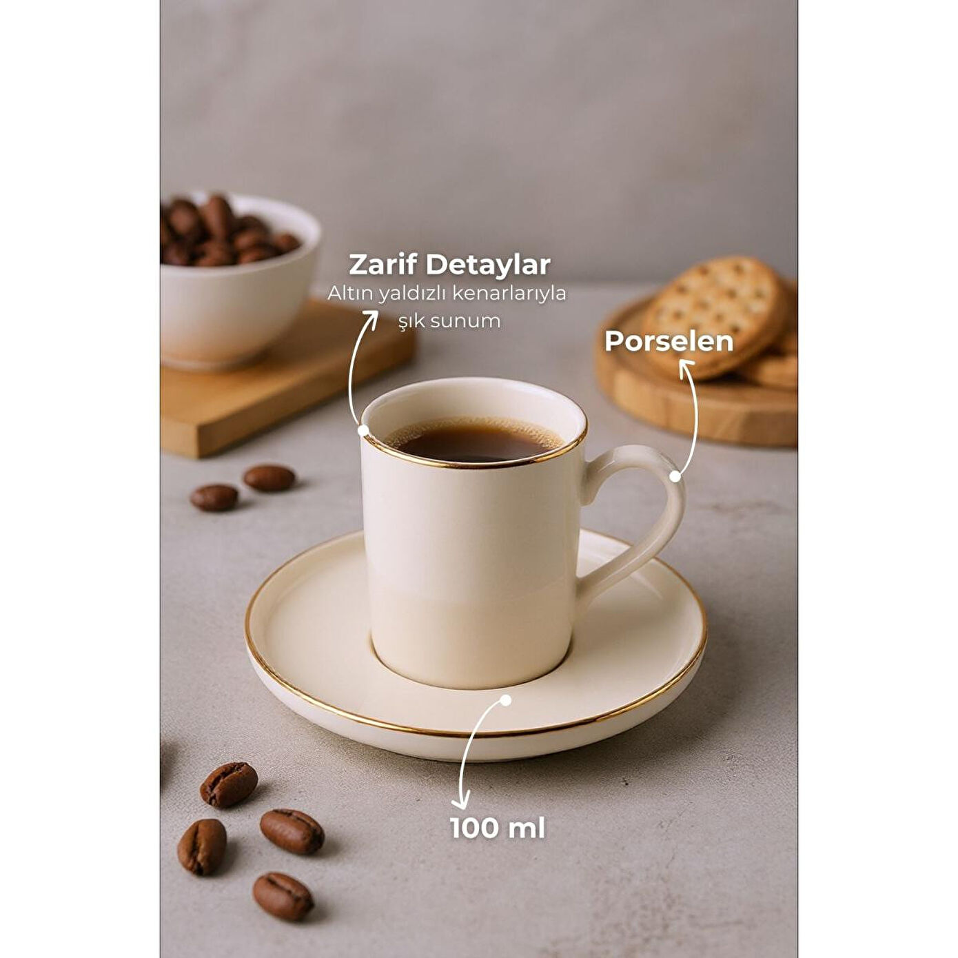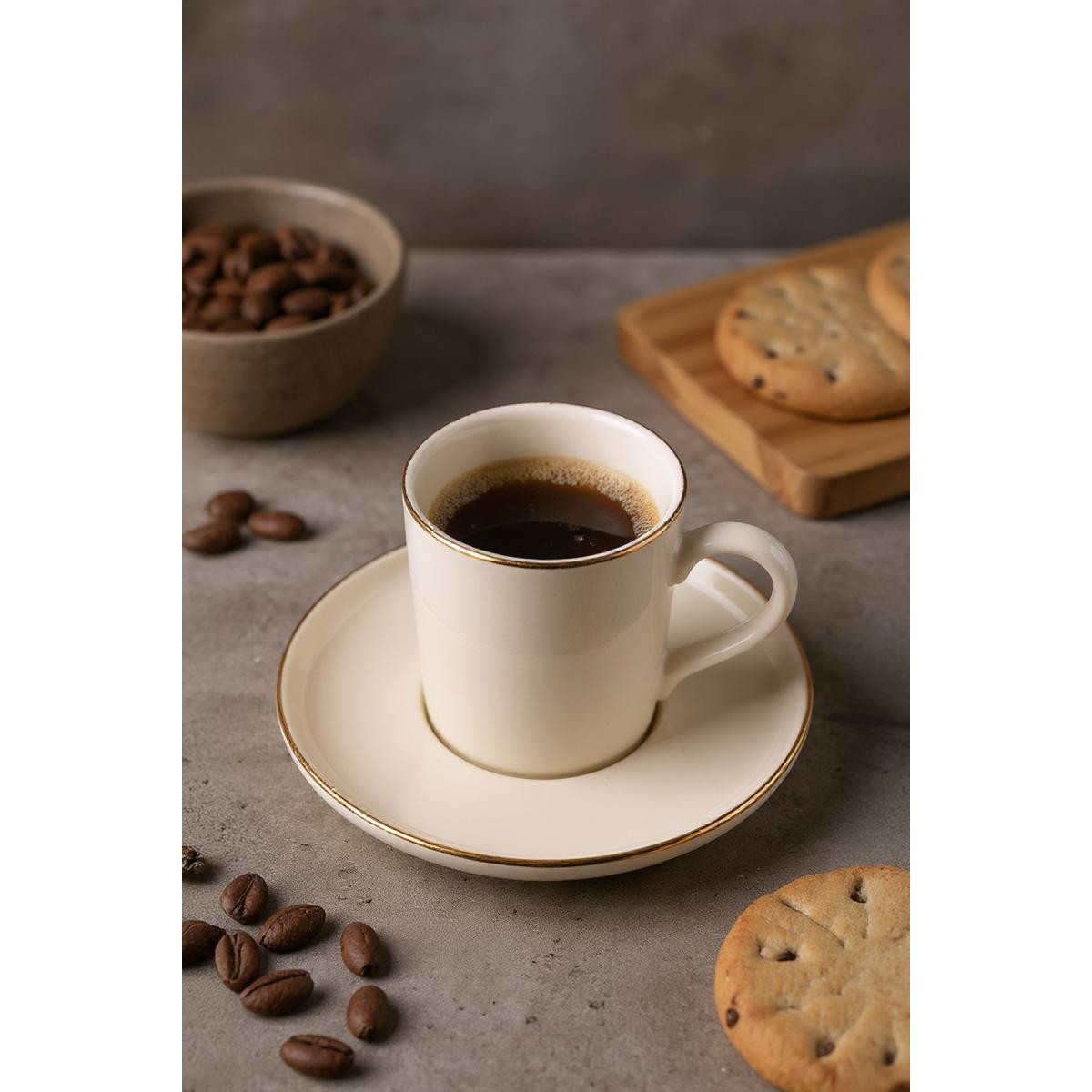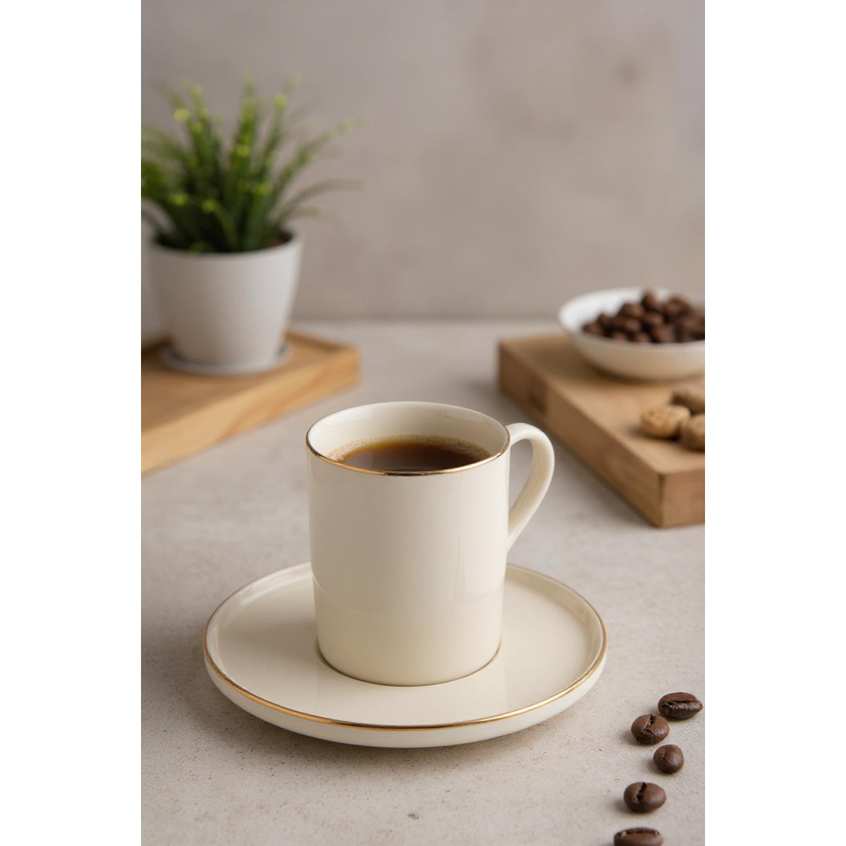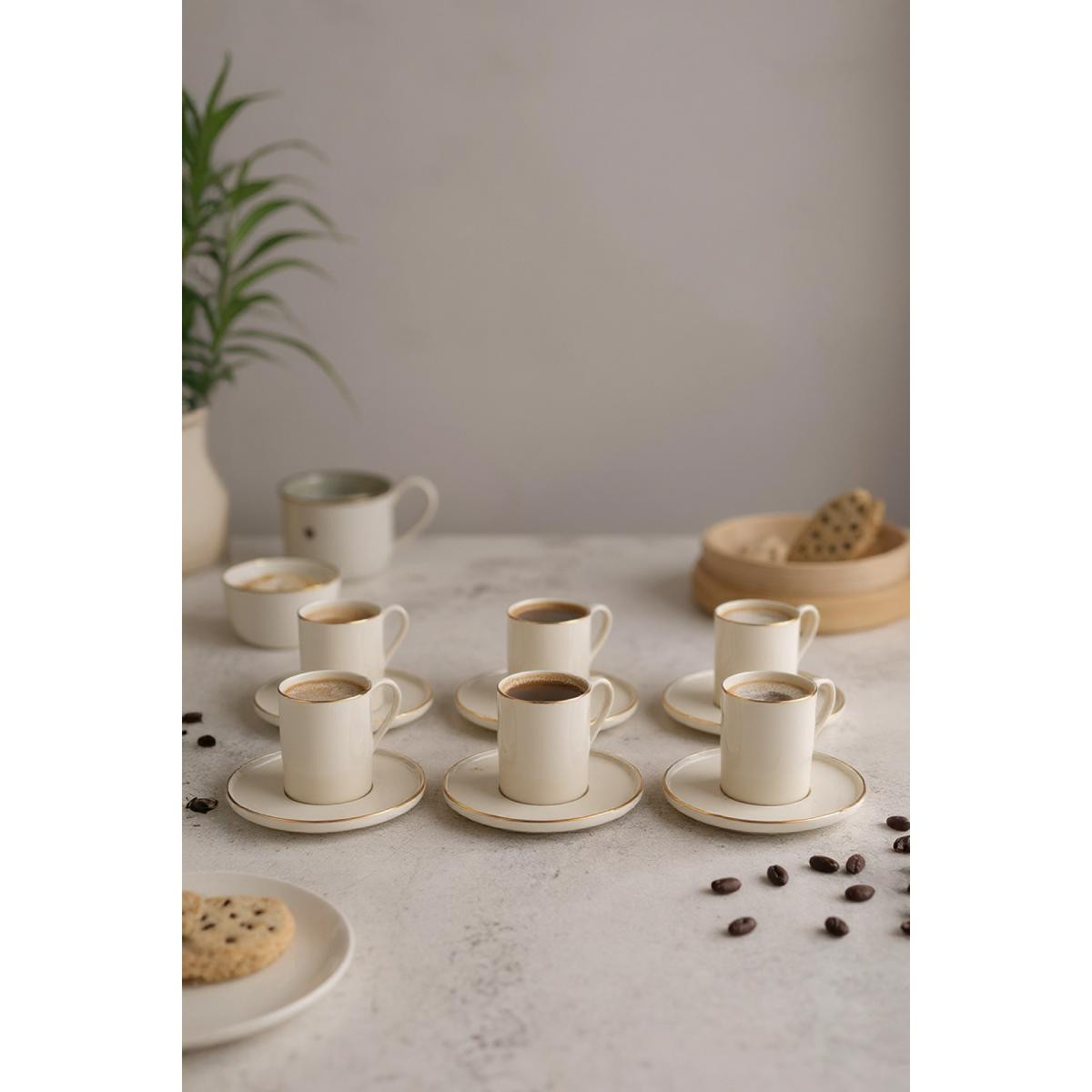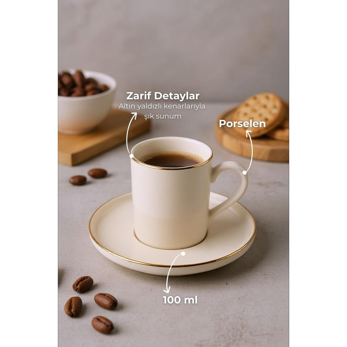 - 6 kişilik geniş kapasitesiyle, aile ve arkadaşlarınızla keyifli kahve sohbetleriniz için ideal.; - Modern tasarımıyla mutfak dekorunuza şık bir dokunuş ekler.; - 75 ml hacmi sayesinde kahvenizin tadını doyasıya çıkarmanızı sağlar.; - Bulaşık makinesinde kolayca temizlenebilir olması pratik kullanım sunar.; - Yüksek kaliteli porselen malzemesi uzun ömürlü kullanım vaat eder.