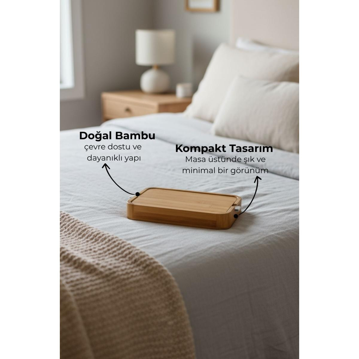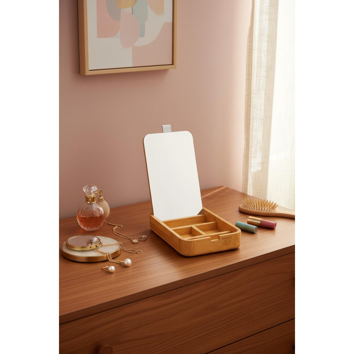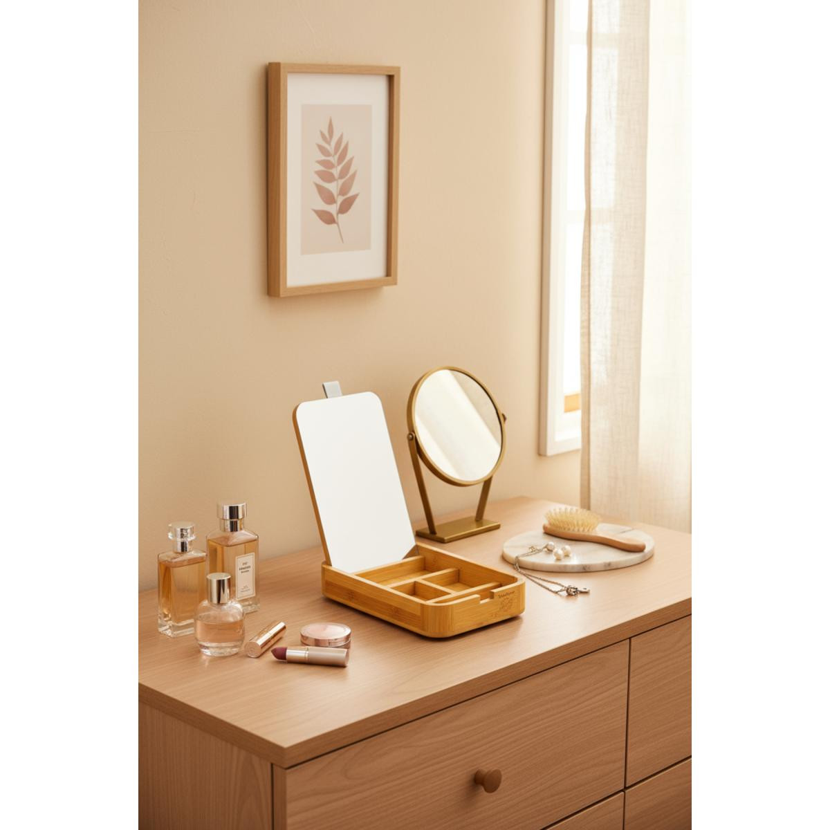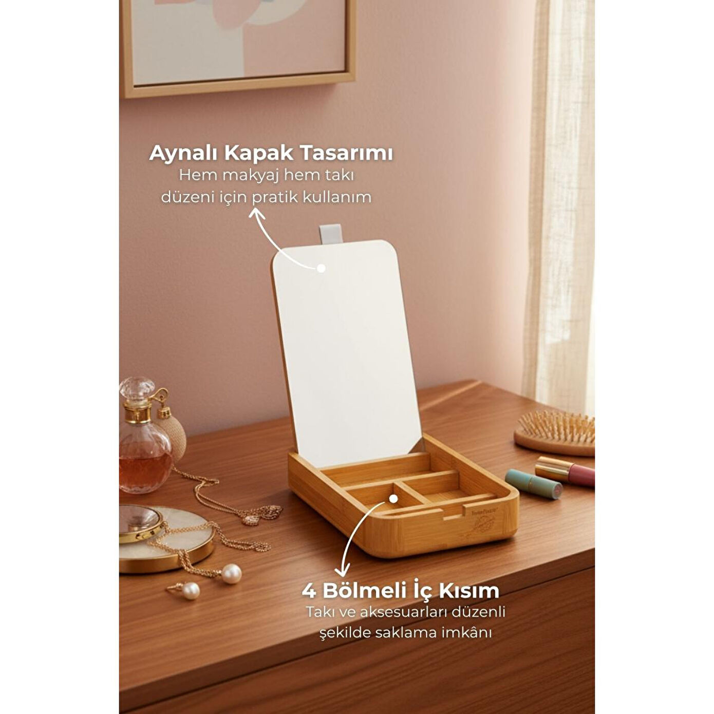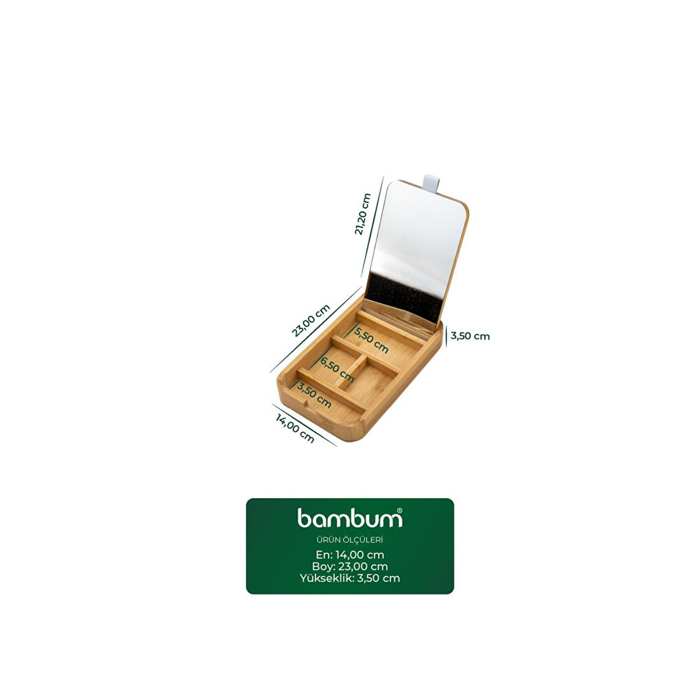 - Bambu malzemesinden üretilmiş, çevre dostu ve dayanıklı yapı.; - Aynalı tasarımı sayesinde makyaj uygulamalarınızı kolayca yapabilirsiniz.; - Kozmetik ürünlerinizi düzenli bir şekilde saklamanızı sağlayacak şık ve fonksiyonel bir kutu.; - Makyaj çantanızda veya banyo tezgahınızda yer kaplamayan kompakt boyutları ile pratik kullanım sunar.