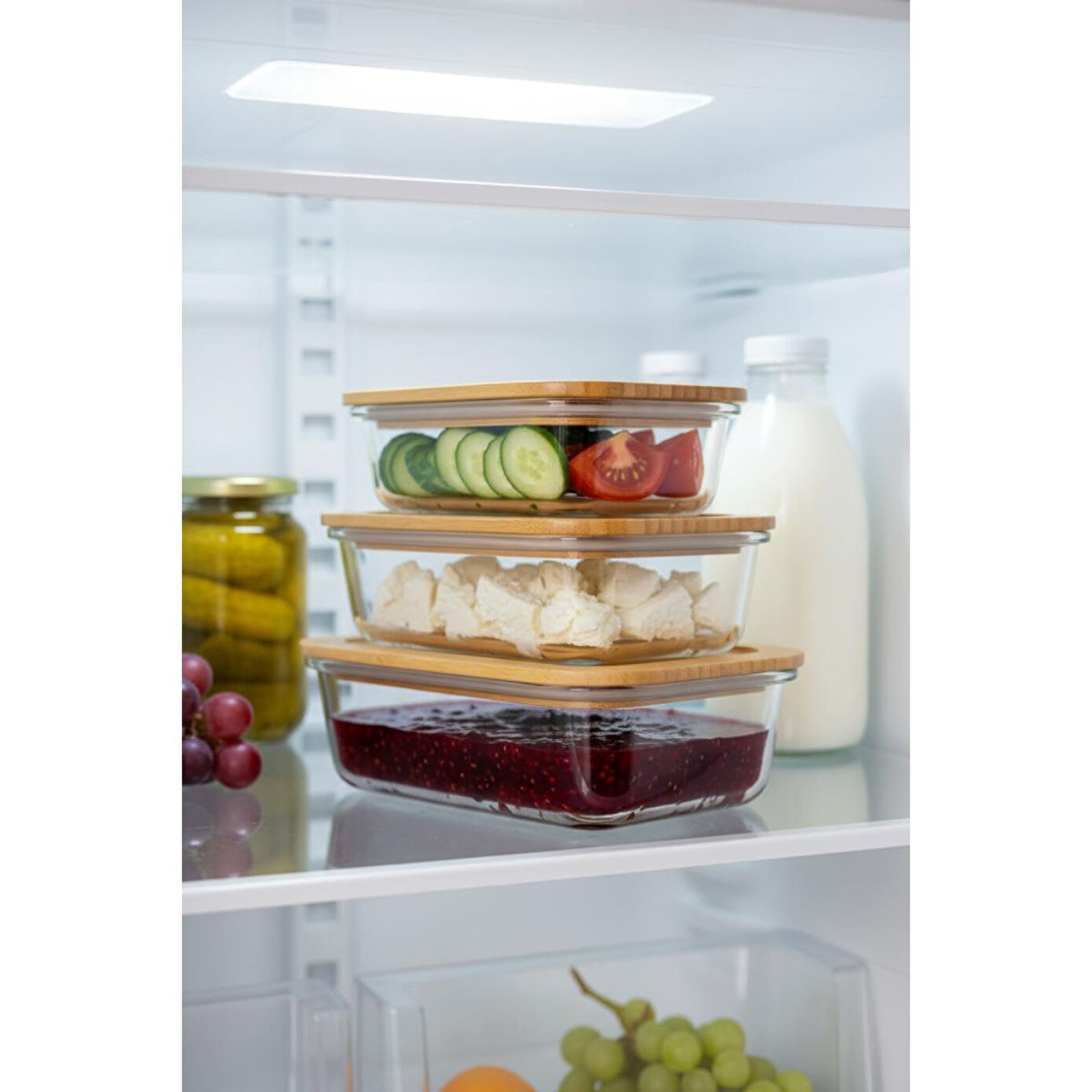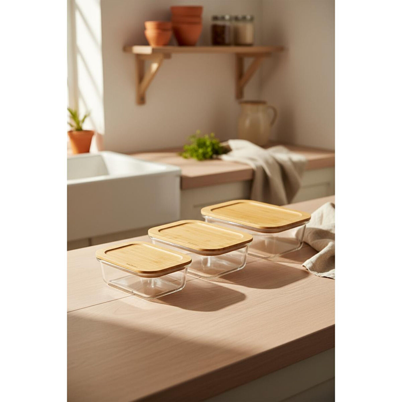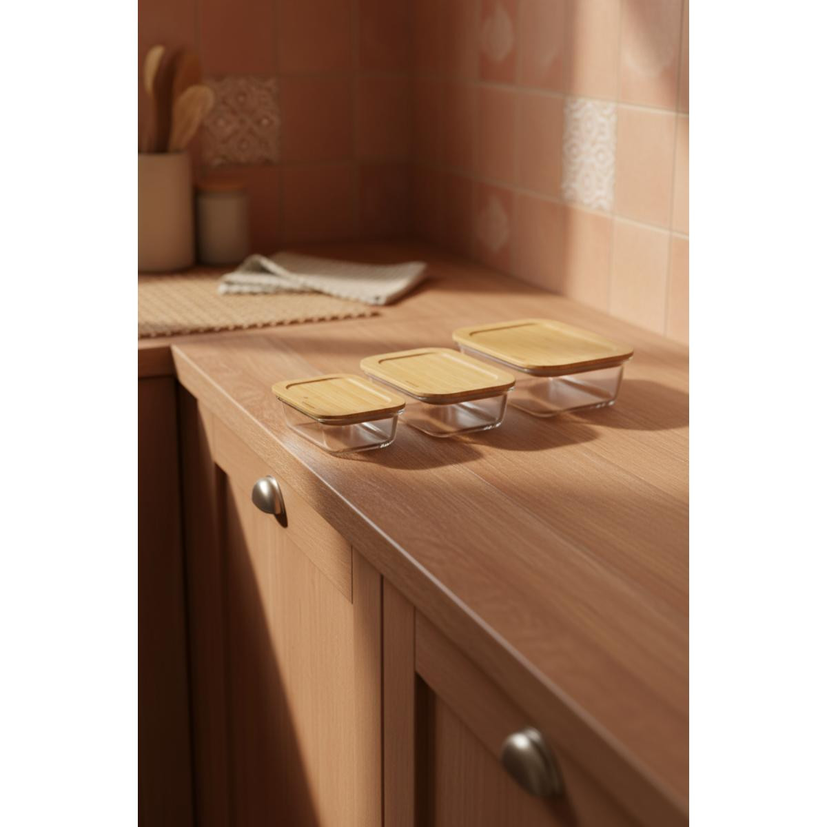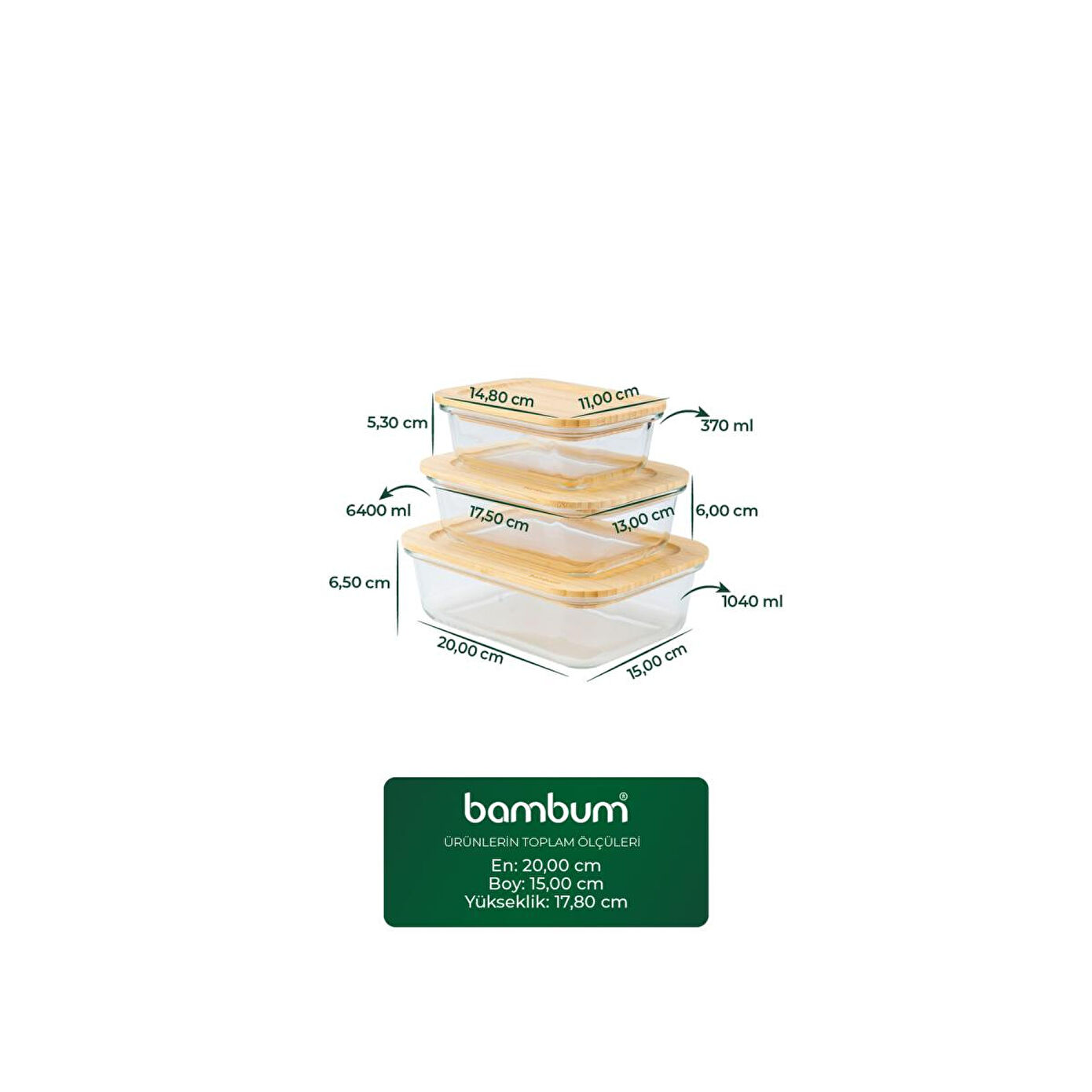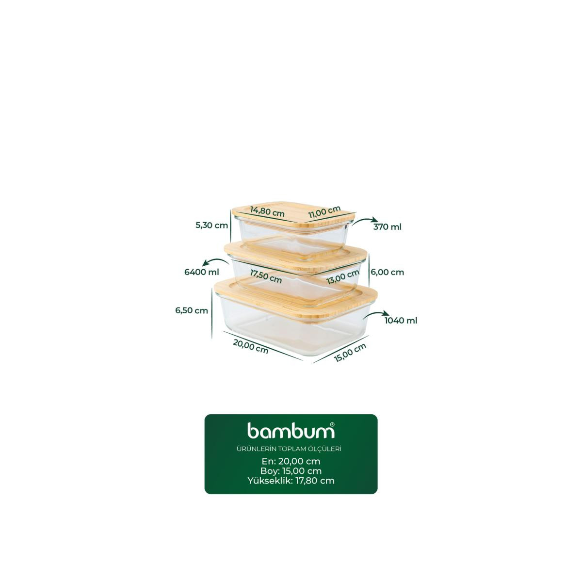 Lavi Dikdörtgen 3'lü Set Bambu Saklama Kapları.; Paket içeriği: 1 adet küçük, 1 adet orta ve 1 adet büyük olmak üzere 3 adet bambu kapaklı saklama kabı bulunur.; Ürün ölçüleri: Küçük kap 15 × 11 × 5,5 cm / 370 ml, orta kap 17,5 × 13 × 6,5 cm / 640 ml, büyük kap 20 × 15 × 6,5 cm / 1040 ml’dir.; Ürün hacmi: Farklı boyutlar sayesinde yemek, salata, meze ve gıda saklamak için ideal kapasite sunar.; Ürün malzemesi: Cam gövde ve doğal bambu kapaklardan oluşur.; Ürün rengi: Şeffaf cam ve doğal bambu tonlarında modern bir görünüm sunar.; Kullanım alanları: Buzdolabı saklama, yemek hazırlama, servis ve mutfak düzeninde kullanılabilir.; Temizleme talimatları: Cam kaplar elde veya makinede yıkanabilir; bambu kapak nemli bezle temizlenmelidir.; Kullanılmaması gereken alanlar: Bambu kapaklar fırın, mikrodalga ve bulaşık makinesinde kullanılmamalıdır.; Ek bilgi: Cam kaplar mikrodalga ve fırın ile uyumludur; ısıya dayanıklı yapıları sayesinde güvenli kullanım sağlar.