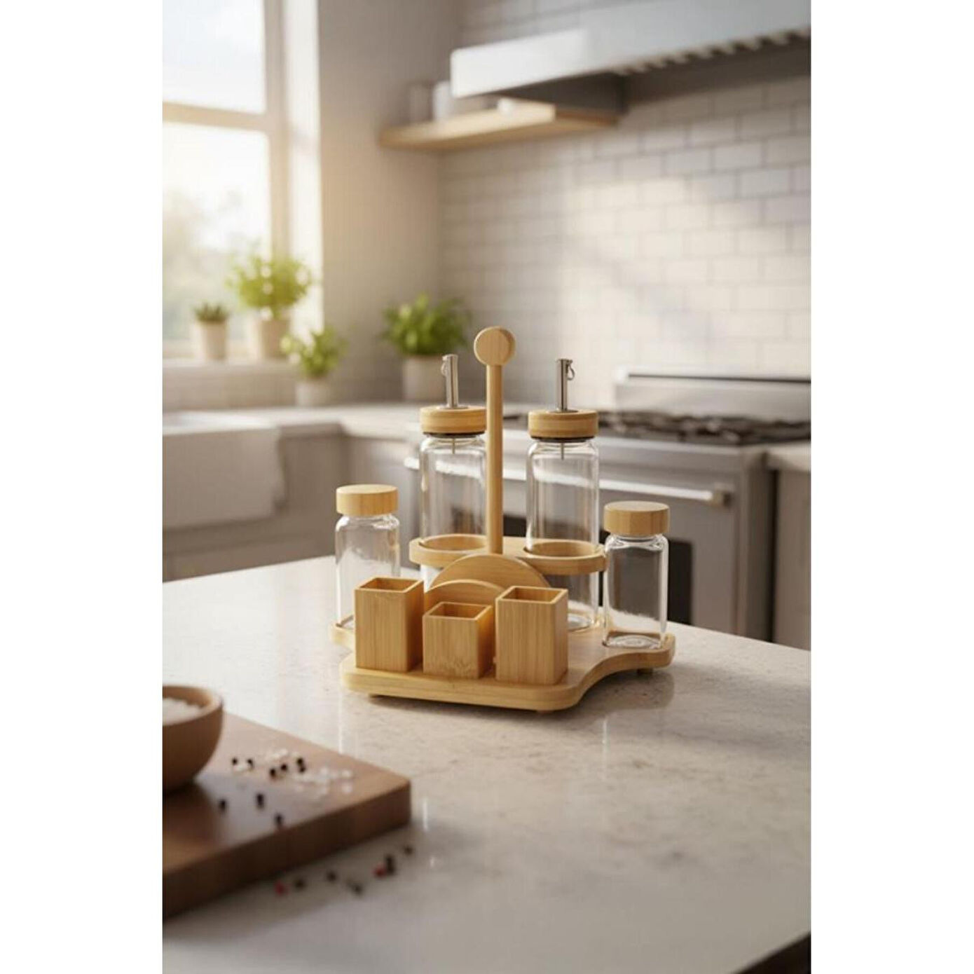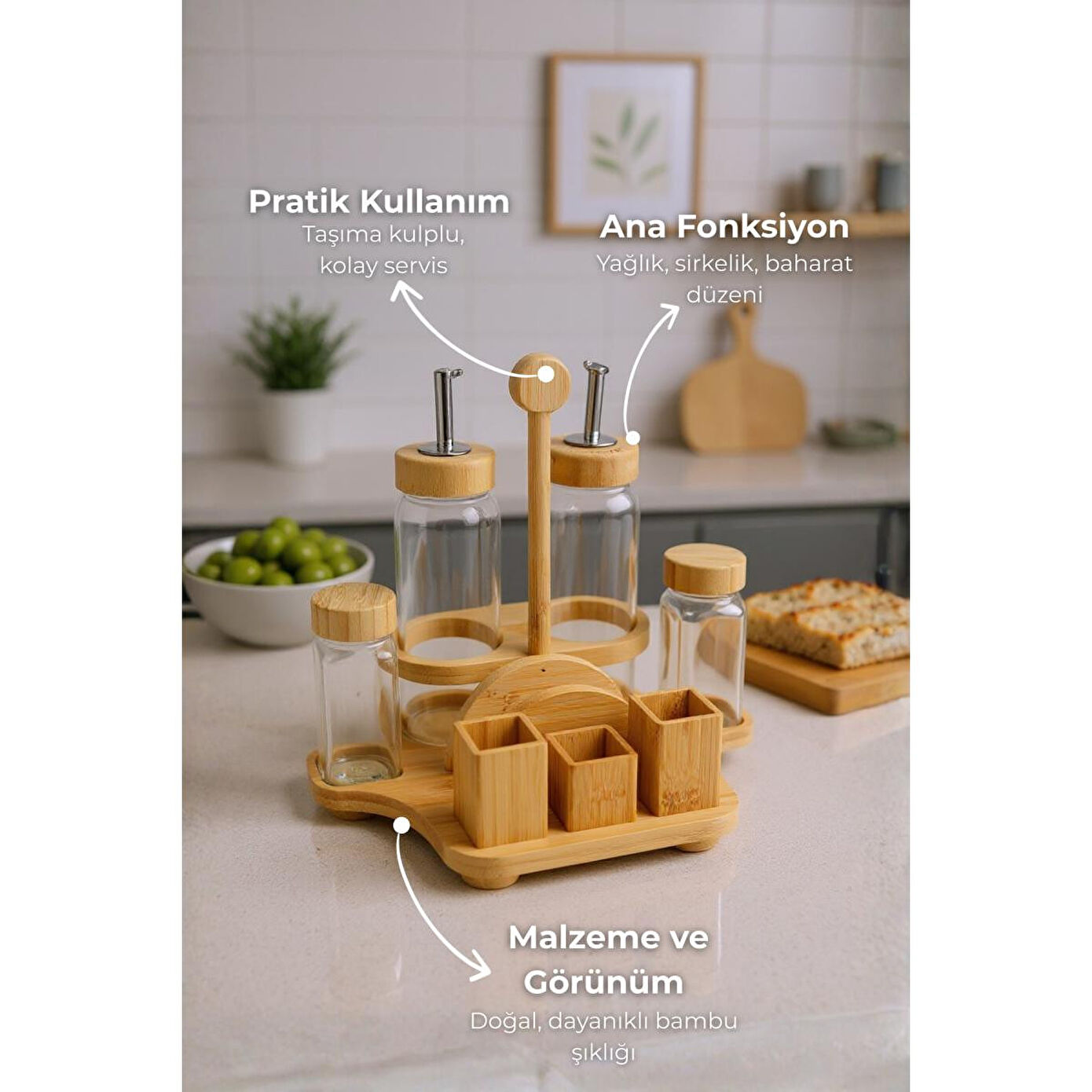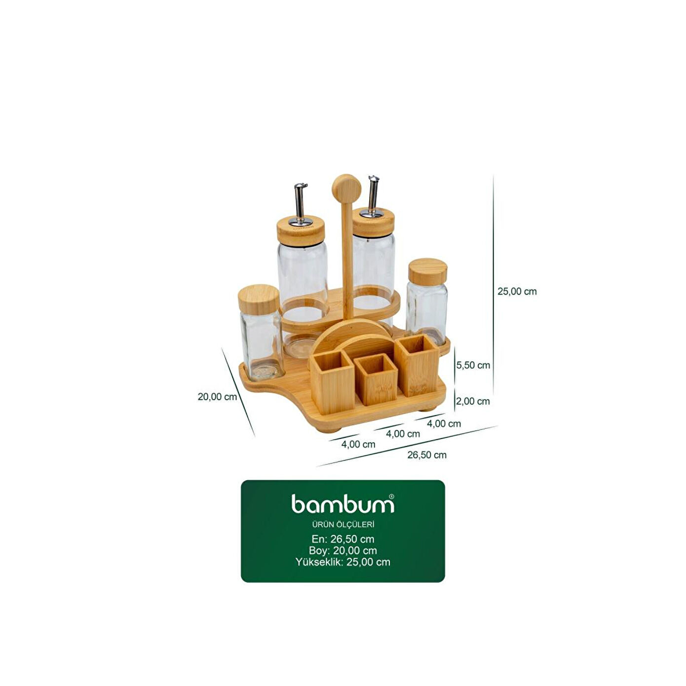 Bambum Mima Çok Amaçlı Menaj Takımı | Peçetelik, Yağdanlık & Baharatlık Seti, BüyükSofralarınızın ve mutfak tezgâhınızın tüm ihtiyaçlarını tek bir şık tasarımda buluşturan Bambum Mima Çok Amaçlı Menaj Takımı ile tanışın! Yağdanlık, sirkelik, tuzluk, biberlik ve peçeteliği bir araya getiren bu set, bambunun doğal sıcaklığını camın zarafetiyle birleştirerek sunumlarınıza düzen ve estetik katıyor.; Ürün İçeriği2 adet Cam Yağdanlık / Sirkelik (Her biri 300 ml)2 adet Cam Baharatlık (Tuzluk & Biberlik) (Her biri 120 ml)1 adet Bambu Stand (Entegre Peçetelikli) Ürün ÖzellikleriMalzeme: Yüksek kaliteli cam (yağdanlık, baharatlık) ve %100 doğal bambu (stand ve peçetelik).; Tasarım: Sofra veya tezgah üzerindeki tüm temel ihtiyaçları (yağ, sirke, tuz, biber, peçete) tek bir şık stant üzerinde toplayan çok fonksiyonlu tasarım.; Kapasite: Yağdanlık: 300 ml | Baharatlık: 120 mlStandlı Toplam Boyut: En: 26.5 cm, Boy: 20 cm, Yükseklik: 25 cm.; Tek Yağdanlık Boyutu: Genişlik: 6 cm, Yükseklik: 21 cm.; Tek Baharatlık Boyutu: Genişlik: 4.5 cm, Yükseklik: 11 cm.; Kullanım Alanı: Yemek masaları, mutfak tezgahları, restoran, kafe ve kahvaltı salonları için idealdir.; Neden Tercih Etmelisiniz?Hepsi Bir Arada Çözüm: Masanızın veya tezgahınızın ihtiyacı olan her şey; yağlık, sirkelik, tuzluk, biberlik ve peçetelik tek bir şık üründe birleşiyor.; Maksimum Düzen: Dağınıklığı ortadan kaldırır, tüm servis gereçlerinizi derli toplu ve estetik bir şekilde bir arada tutar.; Doğal ve Şık Estetik: Bambu ve camın zarif uyumu, her türlü masa ve mutfak dekorasyonuna sıcak ve modern bir hava katar.; Sağlıklı ve Pratik: Cam, gıdaları saklamak için en sağlıklı malzemedir.; Şeffaf yapısı sayesinde içindekileri kolayca takip edebilirsiniz.; Kullanışlı ve Düşünceli Hediye: Yeni ev kuranlar, evini yenileyenler veya düzenli sunumları sevenler için mükemmel bir hediye seçeneğidir.; Anahtar Kelimelermenaj takımı, peçetelikli baharatlık, yağlık sirkelik seti, bambu menaj takımı, Bambum Mima, mutfak düzenleyici, sofra servis seti, tuzluk biberlik takımı, hepsi bir arada set, restoran seti