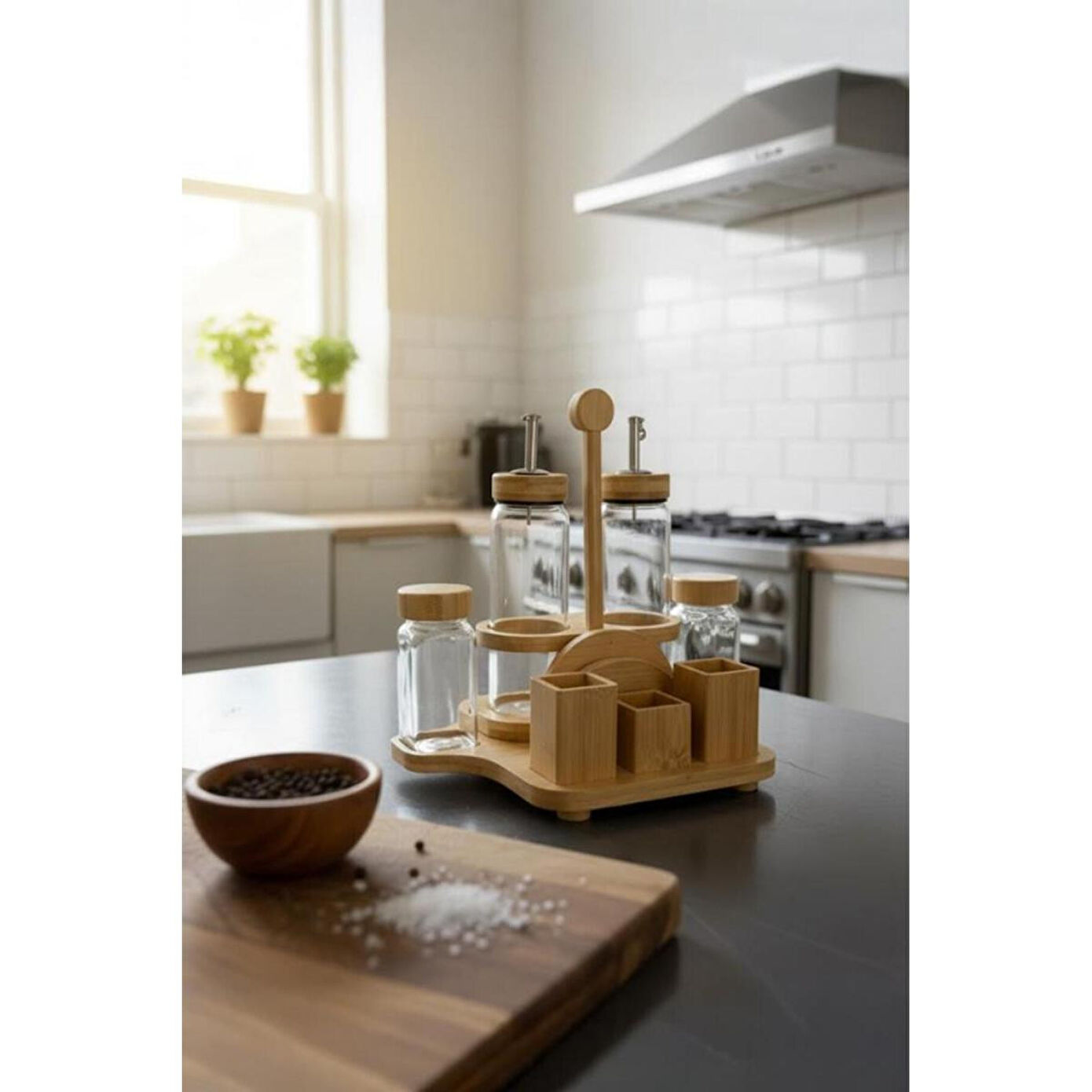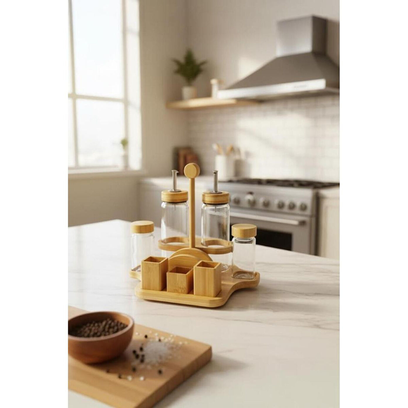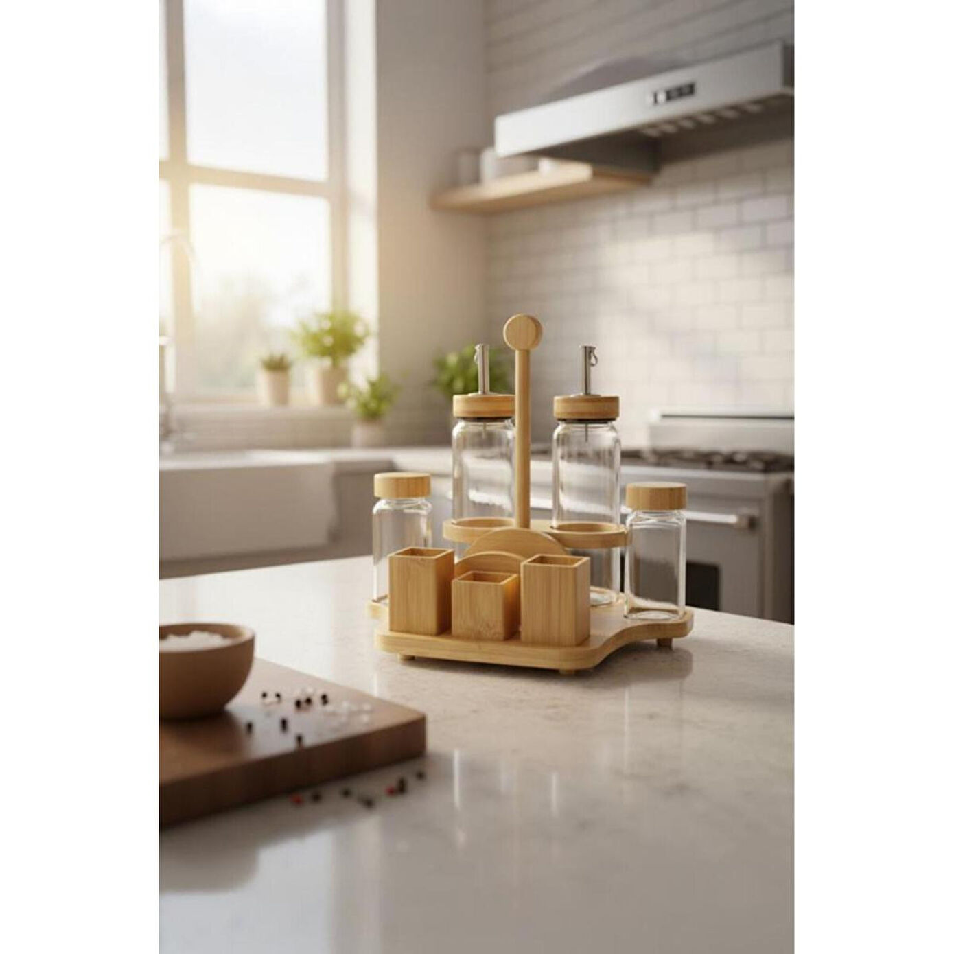 Bambum Mima Çok Amaçlı Menaj Takımı | Peçetelik, Yağdanlık & Baharatlık Seti, BüyükSofralarınızın ve mutfak tezgâhınızın tüm ihtiyaçlarını tek bir şık tasarımda buluşturan Bambum Mima Çok Amaçlı Menaj Takımı ile tanışın! Yağdanlık, sirkelik, tuzluk, biberlik ve peçeteliği bir araya getiren bu set, bambunun doğal sıcaklığını camın zarafetiyle birleştirerek sunumlarınıza düzen ve estetik katıyor.; Ürün İçeriği2 adet Cam Yağdanlık / Sirkelik (Her biri 300 ml)2 adet Cam Baharatlık (Tuzluk & Biberlik) (Her biri 120 ml)1 adet Bambu Stand (Entegre Peçetelikli) Ürün ÖzellikleriMalzeme: Yüksek kaliteli cam (yağdanlık, baharatlık) ve %100 doğal bambu (stand ve peçetelik).; Tasarım: Sofra veya tezgah üzerindeki tüm temel ihtiyaçları (yağ, sirke, tuz, biber, peçete) tek bir şık stant üzerinde toplayan çok fonksiyonlu tasarım.; Kapasite: Yağdanlık: 300 ml | Baharatlık: 120 mlStandlı Toplam Boyut: En: 26.5 cm, Boy: 20 cm, Yükseklik: 25 cm.; Tek Yağdanlık Boyutu: Genişlik: 6 cm, Yükseklik: 21 cm.; Tek Baharatlık Boyutu: Genişlik: 4.5 cm, Yükseklik: 11 cm.; Kullanım Alanı: Yemek masaları, mutfak tezgahları, restoran, kafe ve kahvaltı salonları için idealdir.; Neden Tercih Etmelisiniz?Hepsi Bir Arada Çözüm: Masanızın veya tezgahınızın ihtiyacı olan her şey; yağlık, sirkelik, tuzluk, biberlik ve peçetelik tek bir şık üründe birleşiyor.; Maksimum Düzen: Dağınıklığı ortadan kaldırır, tüm servis gereçlerinizi derli toplu ve estetik bir şekilde bir arada tutar.; Doğal ve Şık Estetik: Bambu ve camın zarif uyumu, her türlü masa ve mutfak dekorasyonuna sıcak ve modern bir hava katar.; Sağlıklı ve Pratik: Cam, gıdaları saklamak için en sağlıklı malzemedir.; Şeffaf yapısı sayesinde içindekileri kolayca takip edebilirsiniz.; Kullanışlı ve Düşünceli Hediye: Yeni ev kuranlar, evini yenileyenler veya düzenli sunumları sevenler için mükemmel bir hediye seçeneğidir.; Anahtar Kelimelermenaj takımı, peçetelikli baharatlık, yağlık sirkelik seti, bambu menaj takımı, Bambum Mima, mutfak düzenleyici, sofra servis seti, tuzluk biberlik takımı, hepsi bir arada set, restoran seti