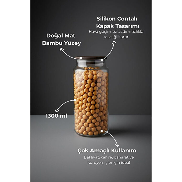 - 1300ml kapasitesiyle geniş iç hacmi, çeşitli yiyeceklerinizi saklamanız için idealdir.; - Şık ve modern tasarımı ile mutfak dekorasyonunuza estetik bir dokunuş katar.; - Bambum Nero Zone markasının kalitesiyle üretilmiş olup, dayanıklılığı ve uzun ömürlü kullanımı garanti eder.; - Cam malzemesi sayesinde yiyeceklerin tazeliğini korur ve kolay temizlenebilir özelliğiyle pratik bir kullanım sunar.;