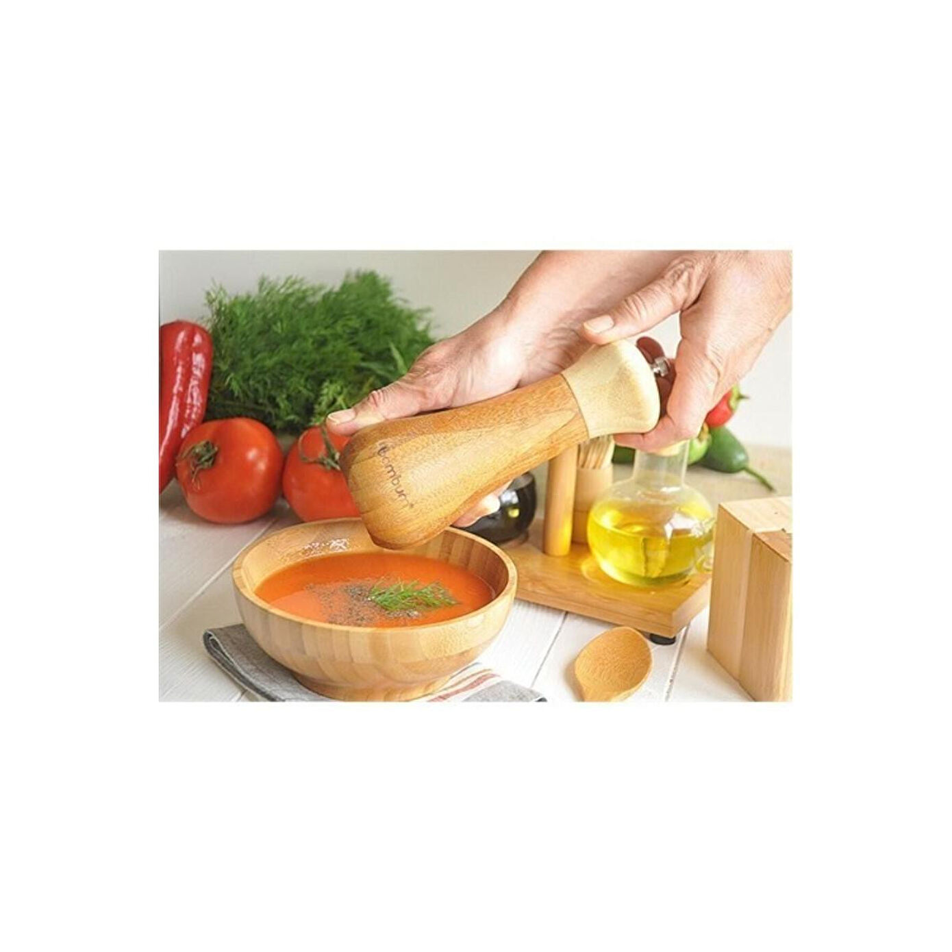 Doğal bambu malzemesi ile üretilmiş, dayanıklı ve estetik bir tasarıma sahip;; Tek parça halinde gelen bu baharatlık, mutfakta kolay kullanım sağlar;; Geniş hacmi sayesinde 500 ml ve üzeri baharatları rahatça öğütebilir;;