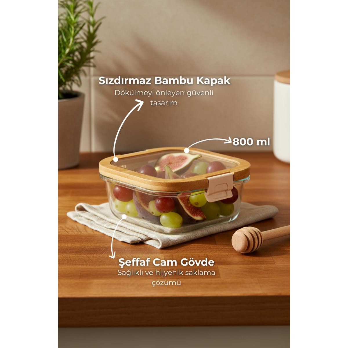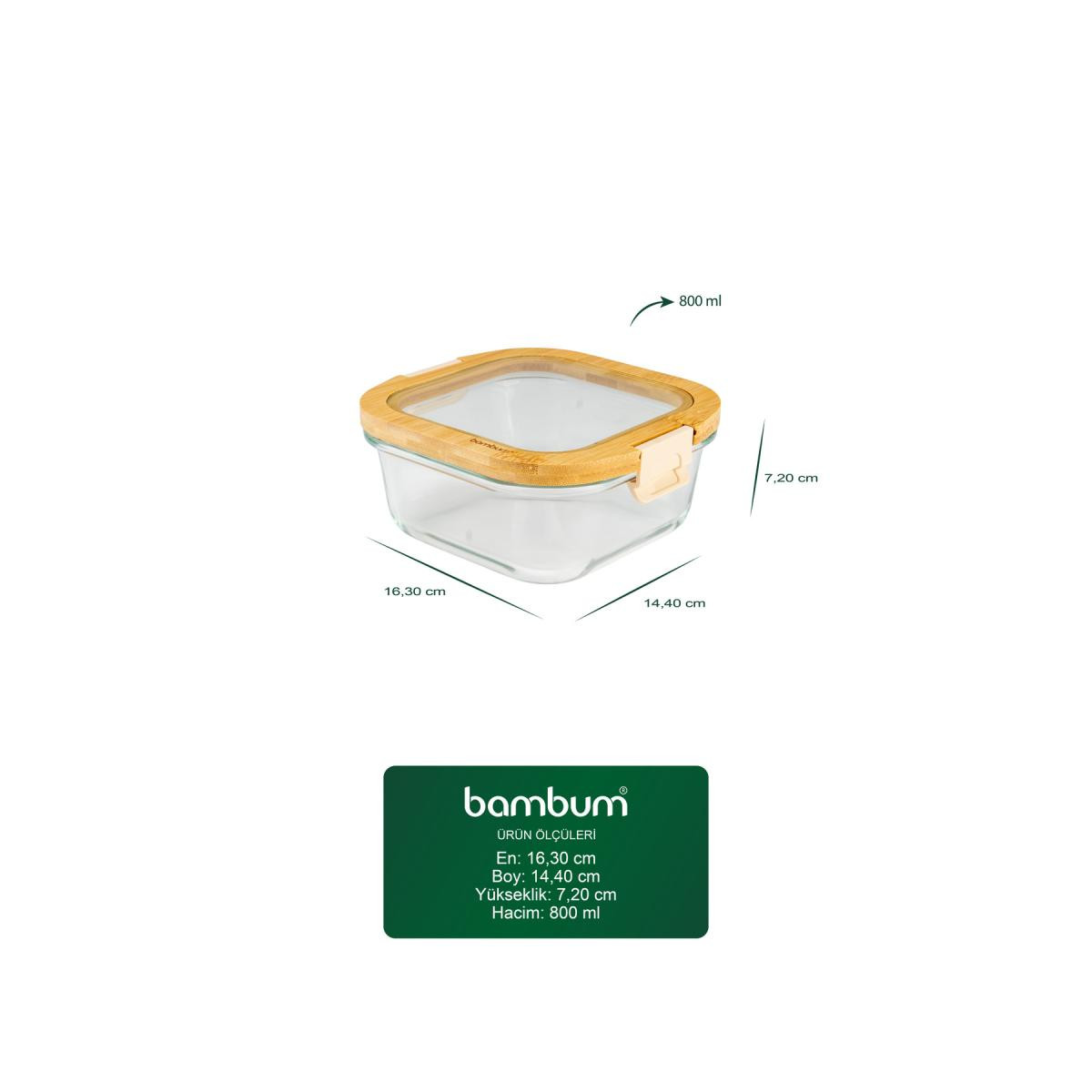 - 800 ml kapasiteli geniş iç hacmi ile günlük kullanım için ideal boyutlarda tasarlanmıştır.; - Bambum Poira cam kapaklı kilitli saklama kabı, yiyeceklerinizi taze tutmak için mükemmel bir çözümdür.; - Hava geçirmez özelliği sayesinde yiyeceklerin tazeliğini korur ve uzun süre saklamanızı sağlar.; - Şeffaf cam malzemesi, içerisindeki yiyeceklerin görünürlüğünü artırarak kolayca kontrol etmenize olanak tanır.; - Estetik bambu kapağı ile mutfak dekorasyonunuza doğal bir dokunuş eklerken, aynı zamanda pratik bir kullanım sunar.; - Kolay temizlenebilir yüzeyi sayesinde hijyenik bir kullanım sağlar ve bulaşık makinesinde yıkanabilir.;