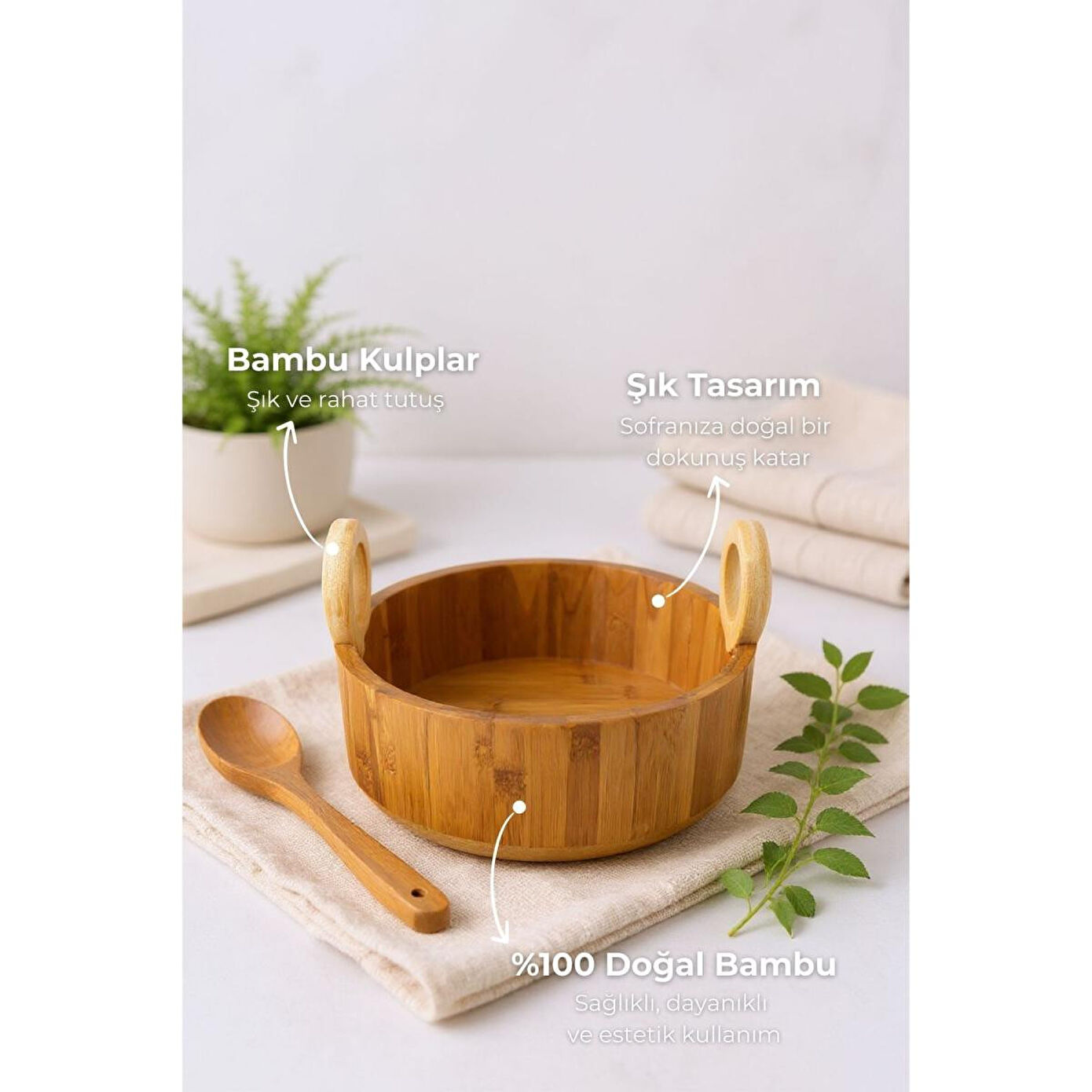 - Bambum Terasa Kulplu Kase, şık tasarımıyla mutfak dekorasyonunuza modern bir dokunuş katar.; - Dayanıklı bambu malzemesi sayesinde uzun ömürlü kullanım sunar ve kolay temizlenebilir özelliğiyle pratiklik sağlar.; - Kulpları sayesinde rahat taşıma imkanı sunarak, yemek servislerinizi daha keyifli hale getirir.; - Her türlü sofra düzenine uyum sağlayan zarif görünümü ile sofralarınızda estetik bir bütünlük oluşturur.