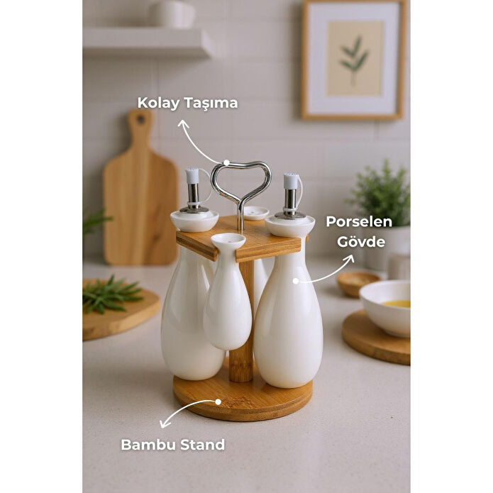 - Bambum Tiago, şık ve modern tasarımıyla mutfaklarınıza estetik bir dokunuş katar.; - Bambu malzemesi sayesinde doğal ve çevre dostu bir kullanım sunar.; - Standlı yapısı ile mutfak tezgahınızda kolayca yer kaplamaz ve düzenli bir görünüm sağlar.; - Yağlık, sirkelik, tuzluk ve biberlik olmak üzere dört farklı kullanım alanı sunarak ihtiyaçlarınıza yönelik pratik bir çözüm sunar.; - Kolay temizlenebilir yüzeyi ile hijyenik bir kullanım imkanı sağlar.;