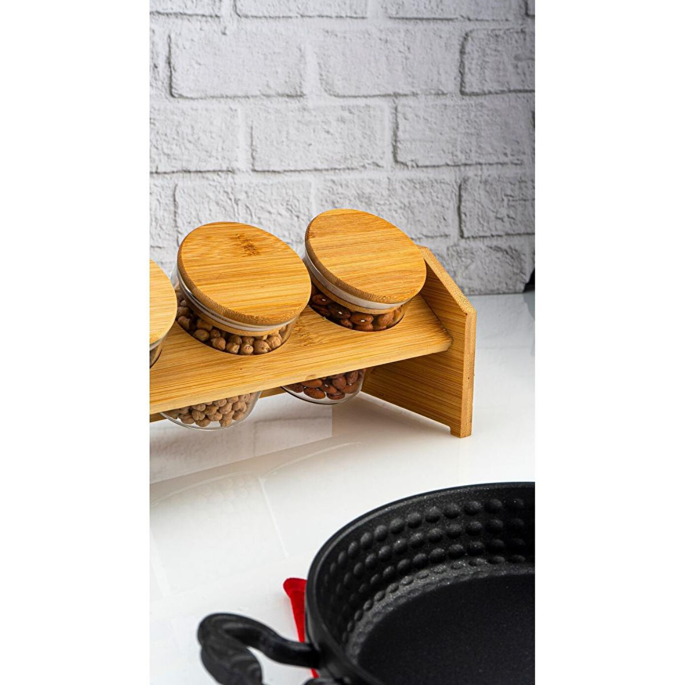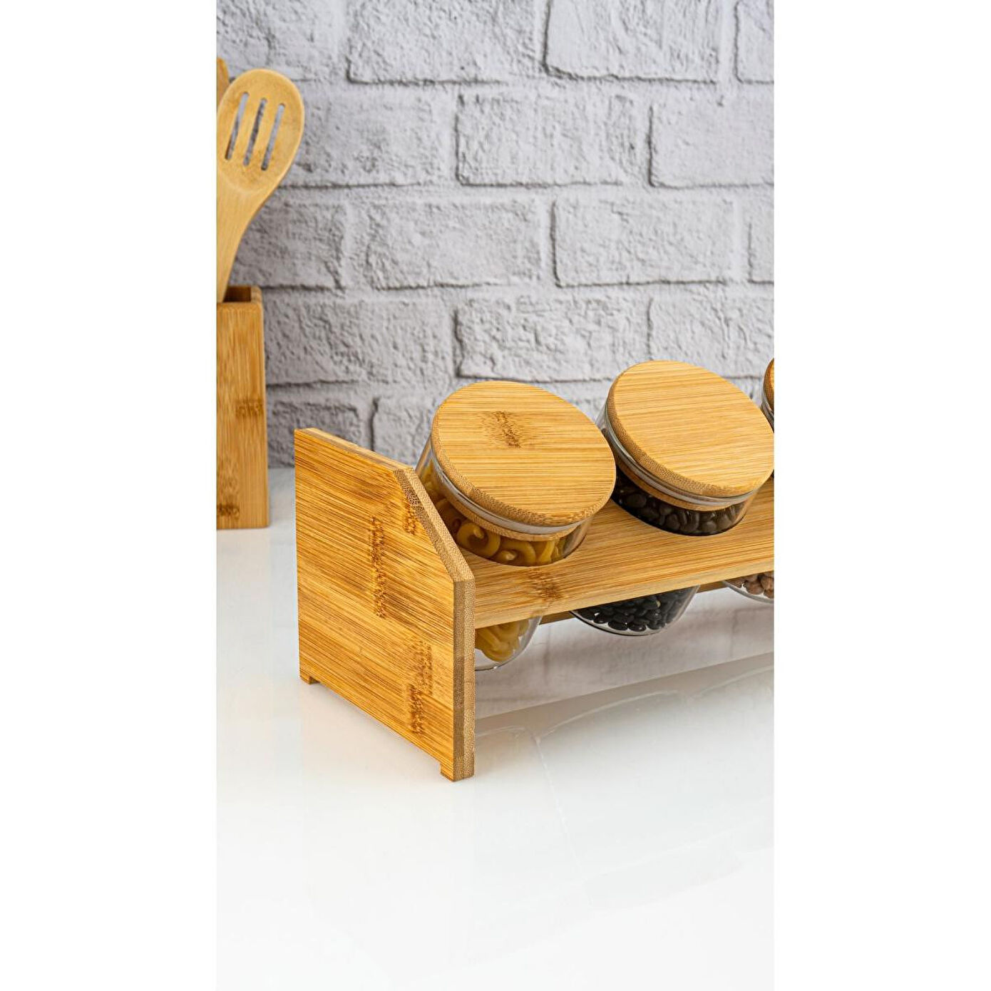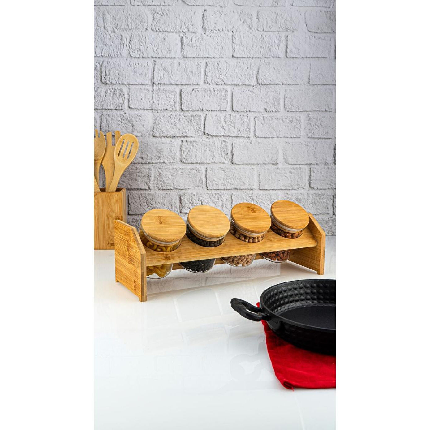 - Doğal bambu malzemesi sayesinde uzun ömürlü ve dayanıklı kullanım sunar.; - Beş parçadan oluşan set, mutfakta ihtiyaç duyulan baharatları düzenli bir şekilde saklama imkanı sağlar.; - Standlı tasarımı ile baharatların kolayca erişilebilir olmasını ve mutfak tezgahında yer tasarrufu yapmanızı sağlar.; - Geniş kapasiteli dokusuyla sık sık doldurulmasını gerektiren baharat kutuları için idealdir.; - Bambu malzemesinin doğal yapısı sayesinde çevre dostu bir seçimdir ve sürdürülebilirlik açısından tercih edilir.