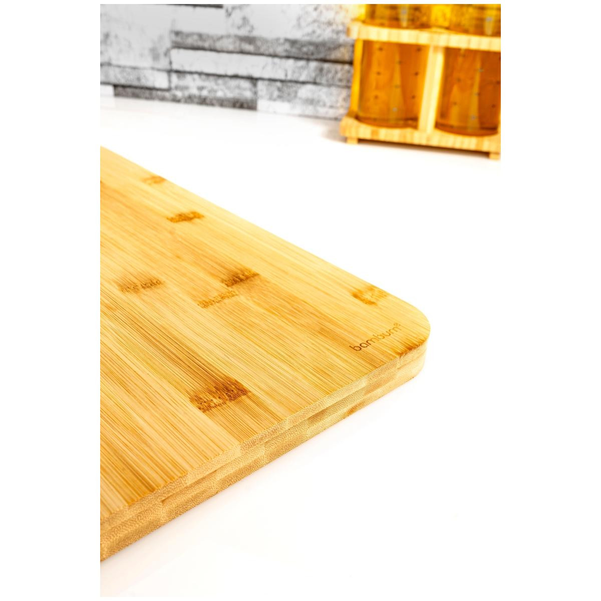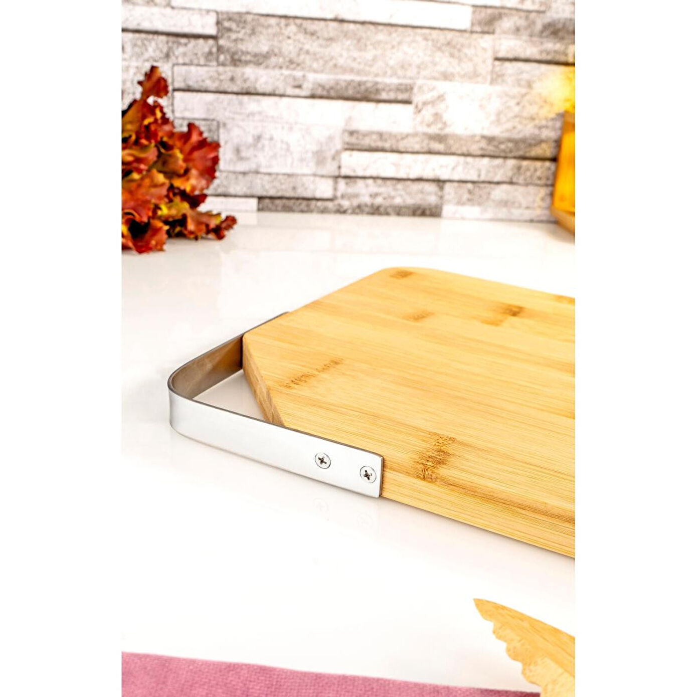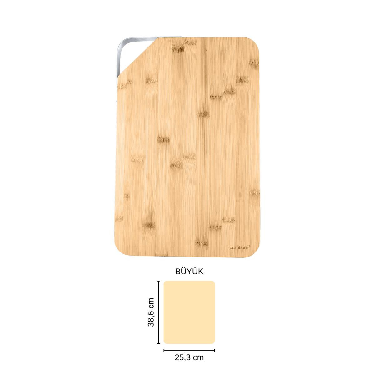 - Doğal bambu malzemesinden üretilmiş, dayanıklı ve uzun ömürlü kullanım sunar.; - Mat yüzeyi sayesinde yiyeceklerinizi kolayca kaydırabilir ve temizliği pratik hale getirir.; - Çelik kulpları ile hem şık görünüm sağlar hem de ısıya karşı yüksek direnç göstererek güvenli bir kullanım imkanı tanır.; - Dikdörtgen tasarımı, çeşitli boyutlardaki kesimler için idealdir ve mutfakta çok yönlülük sunar.