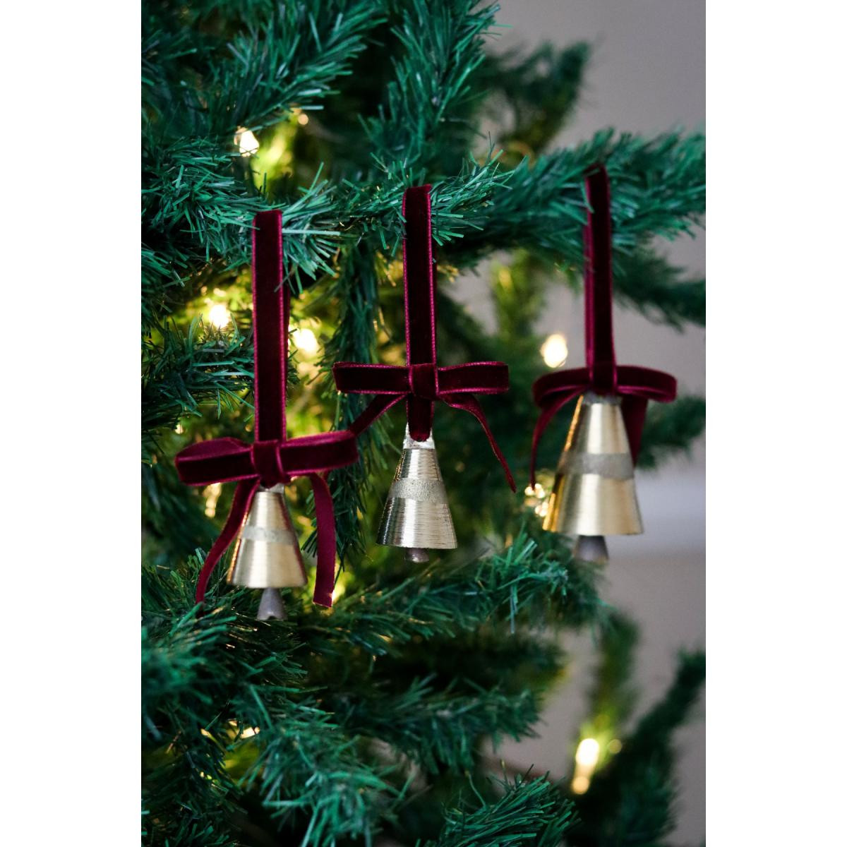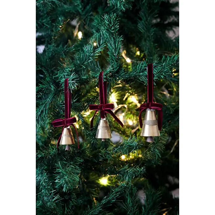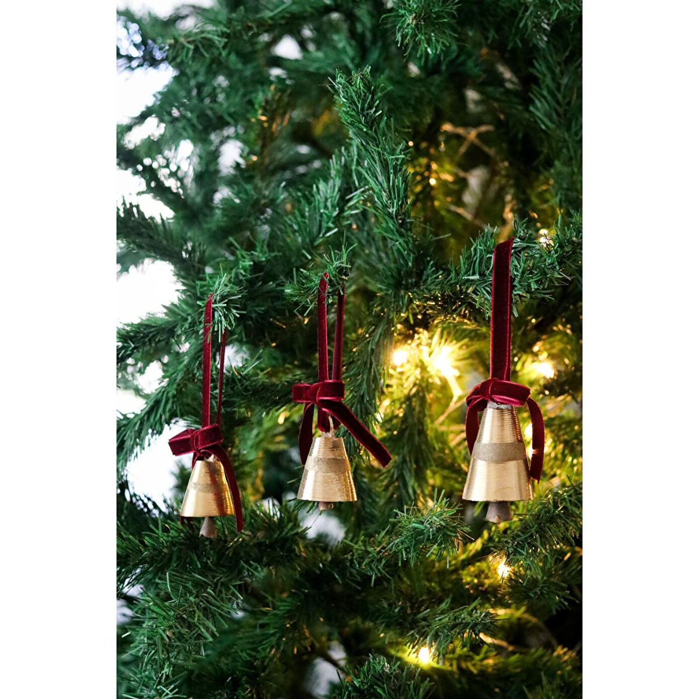 Beige & Stone X Den.ınteriors Yılbaşı Ağacı Süsleme Seti 3'lü Kadife Kurdeleli Gold Renk Çan Ağaç Süsü