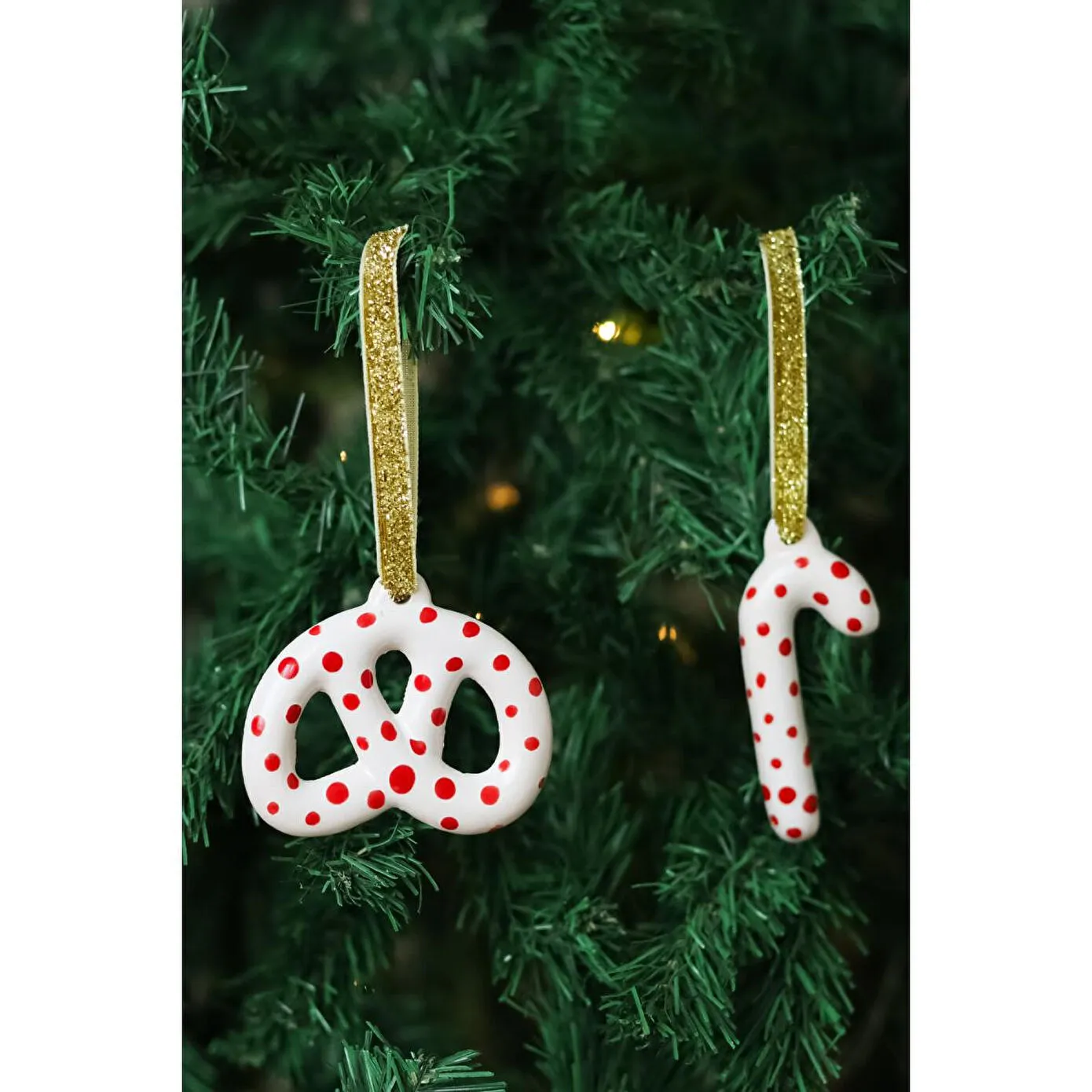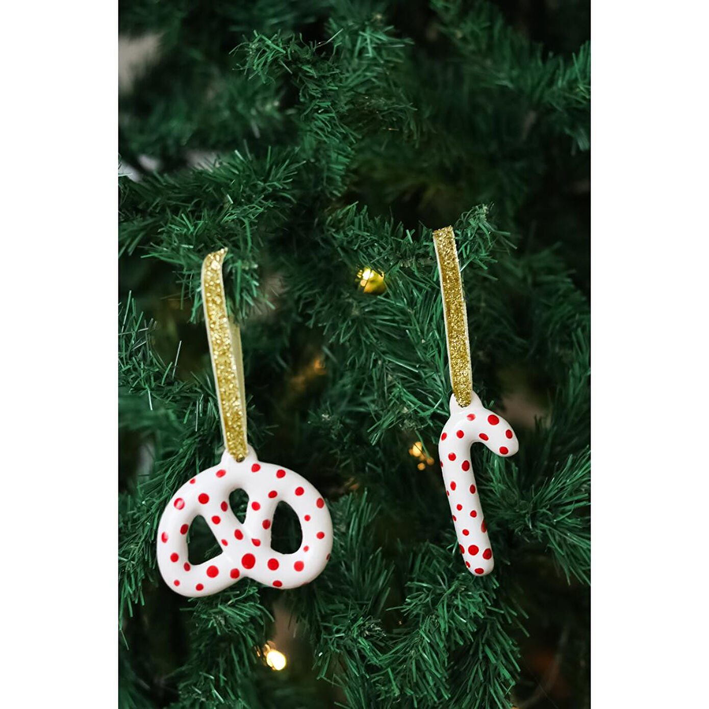 Beige & Stone Yılbaşı Ağaç Süsü Benekli Seramik Pretzel Simit-baston 2'li Çam Ağacı Süsü