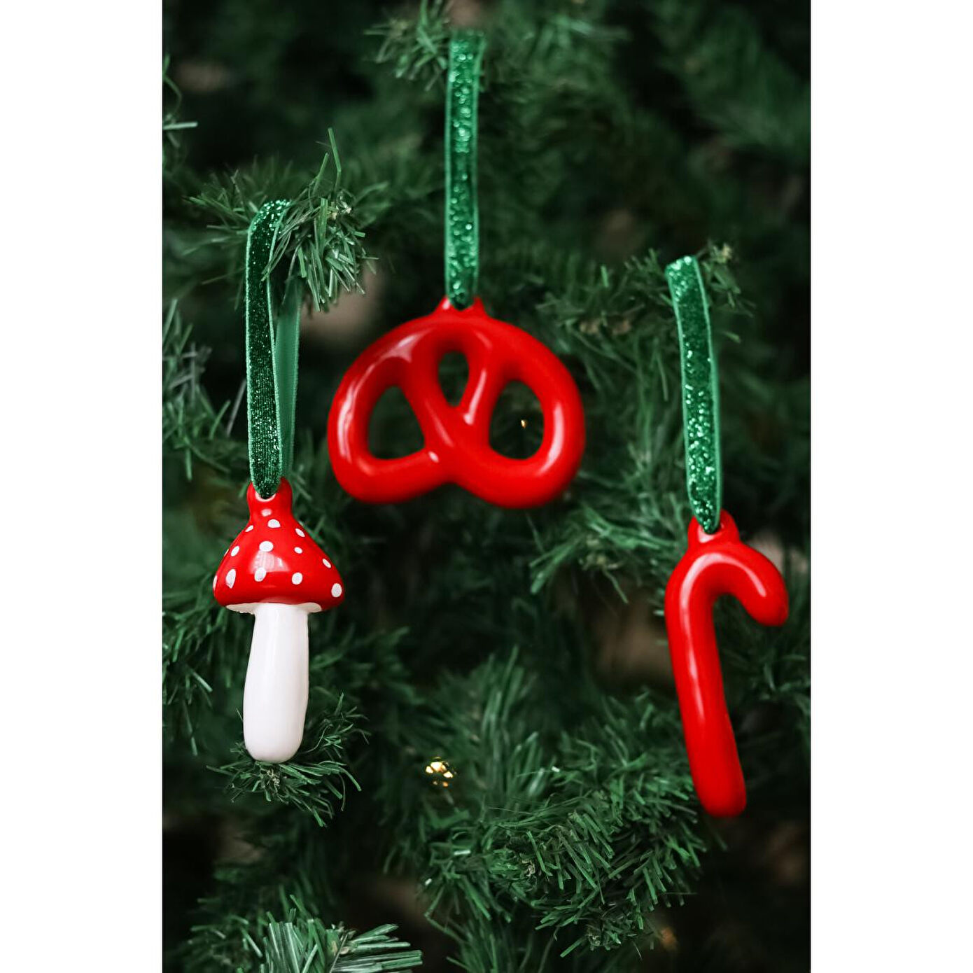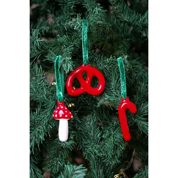 Beige & Stone Yılbaşı Ağaç Süsü Seramik Pretzel Kırmızı Simit,kırmızı Baston Ve Mantar 3'lü Set Çam Ağacı Süsü