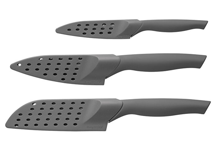 Ürün Açıklaması: Bu üçlü set, mutfağınızın en çok tercih edilen bıçaklarını bir arada sunar. Soyma bıçağı, şef bıçağı ve Santoku bıçağı; tüm kesme, dilimleme ve doğrama ihtiyaçlarınızın %90’ını zahmetsizce karşılar. Yapışmaz paslanmaz çelik gövdeleri, PP + TPE ergonomik saplarıyla kaymaz tutuş sunar. Her bıçak, güvenli saklama için koruyucu kılıfla birlikte gelir. Öne çıkan özellikler: • 18/10 paslanmaz çelik gövde ile uzun ömürlü keskinlik • Ergonomik PP + TPE sap, optimum kontrol • Takılı kılıflarıyla güvenli saklama • Soyma, şef ve Santoku bıçağı üçlüsü • Kolay temizlik için yapışmaz kaplama Teknik Özellikler: • Malzeme: 18/10 paslanmaz çelik • Bıçak Uzunlukları: 10 cm, 13 cm, 14 cm • Sap Malzemesi: PP (Polipropilen) + TPE (Termoplastik elastomer) • Ağırlık (set): 0,4 kg • Bakım: Elde yıkama önerilir