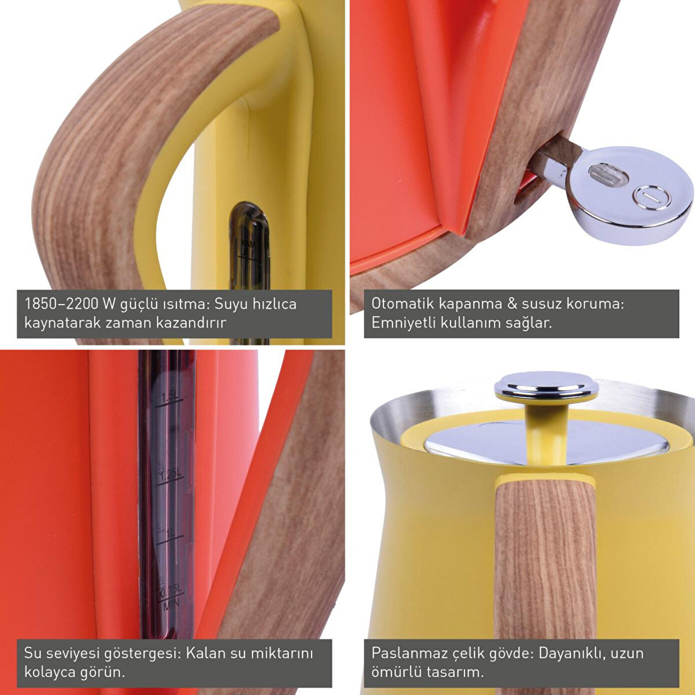 Canlı renk seçenekleriyle mutfağınıza neşeli bir hava katan Natural serisi su ısıtıcılar, 360° dönebilen taban ve su seviyesi göstergesiyle günlük kullanımda pratiklik sunar. STRIX kontrol ünitesi sayesinde uzun ömürlü performans sağlar. Su kaynadığında otomatik kapanma ve susuz çalışmaya karşı koruma özellikleriyle güvenliği ön planda tutar. 1850-2200 W güçlü ısıtma: Suyu hızlıca kaynatarak zaman kazandırır. 1,7 L kapasite: Birden fazla fincan sıcak su hazırlama imkânı. 360° dönebilir taban: Kablo saklama ve esnek yerleştirme kolaylığı. Otomatik kapanma & susuz koruma: Emniyetli kullanım sağlar. Paslanmaz çelik gövde: Dayanıklı, uzun ömürlü tasarım. Teknik Özellikleri: Maksimum güç: 1850-2200 W Hacimsel kapasite: 1,7 L Ürün boyutları (G×D×Y): 18x18x25 cm Ağırlık: 1,3 kg Gerilim: 220-240 V, 50 Hz Malzeme: Paslanmaz çelik gövde Güvenlik: STRIX kontrol ünitesi; otomatik kapanma; susuz çalışma koruması