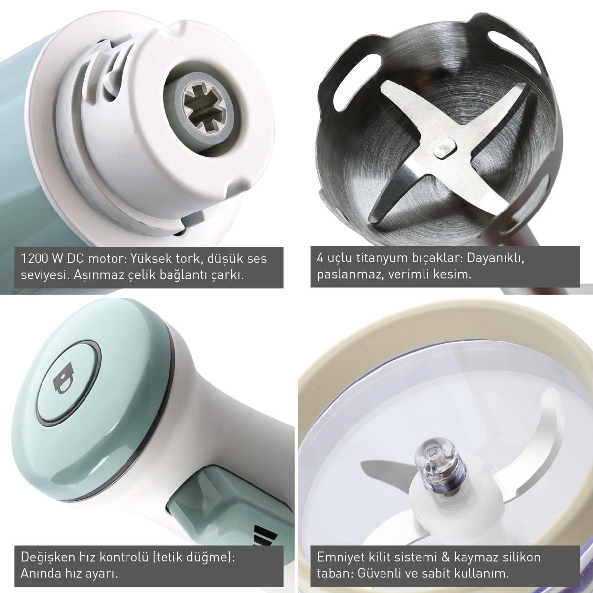 1200 W DC motor: Yüksek tork, düşük ses seviyesi.Aşınmaz çelik bağlantı çarkı. 5 parça aksesuar: 800 ml ölçek kabı, 600 ml hazne ve 400 ml kişisel blender hazneleri, paslanmaz çelik çift çırpıcı, patates ezici. Değişken hız kontrolü (tetik düğme): Anında hız ayarı.Sağlam, uzun ömürlü mekanizma. Emniyet kilit sistemi: Kullanım sırasında ekstra güvenlikli çocuk kilidi özelliği.Teknik Özellikleri: