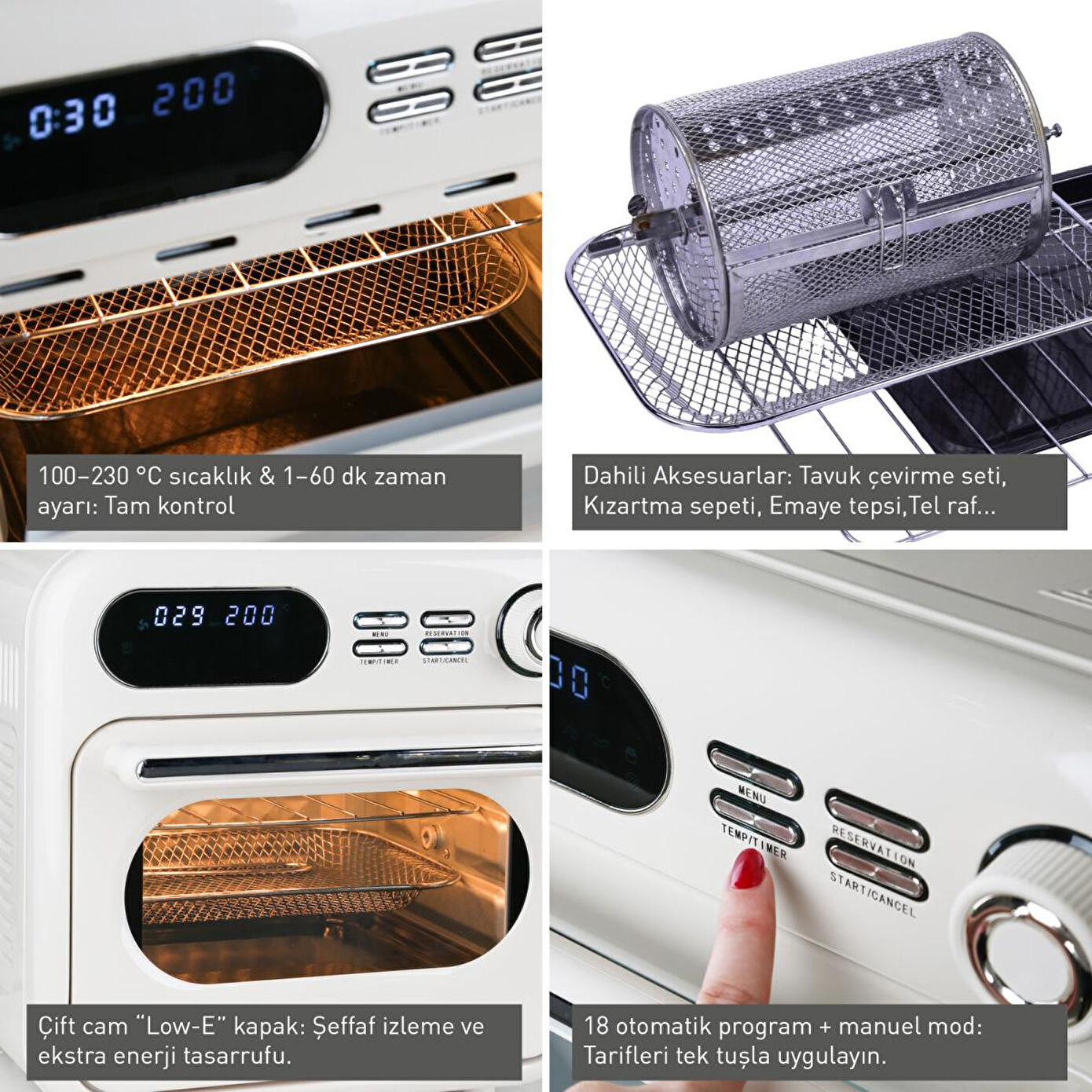 %85’e kadar az yağ kullanımı: Sağlıklı kızartma keyfi. 18 L geniş kapasite: Aile yemeklerine ve parti atıştırmalıklarına uygun. 18 otomatik program + manuel mod: Tarifleri tek tuşla uygulayın. 100–230 °C sıcaklık & 1–60 dk zaman ayarı: Tam kontrol, kusursuz sonuç. Çift cam “Low-E” kapak: Şeffaf izleme ve ekstra enerji tasarrufu.Dahili Aksesuarlar: