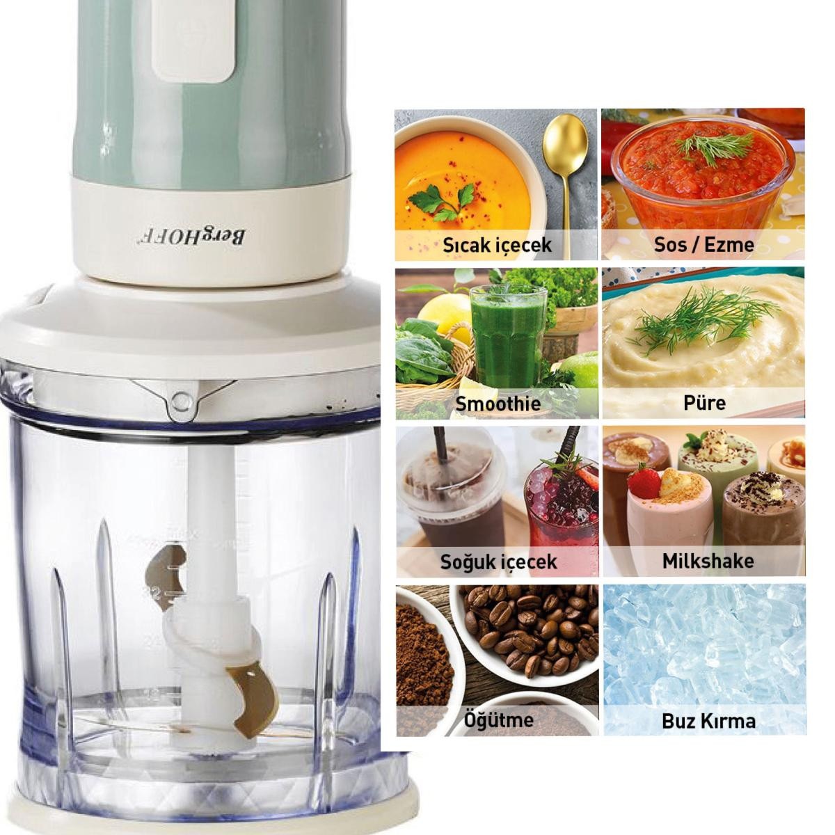 Güç: 700 WHacimsel kapasiteler: 1200 ml doğrayıcı; 600 ml ve 400 ml spor haznelerHız seviyesi: 1 + TurboÜrün boyutları (G×D×Y): 15x24x36 cmAğırlık: 2,59 kgGerilim: 220–240 V, 50 HzMarka Menşei: BelçikaMarka:Berghoff