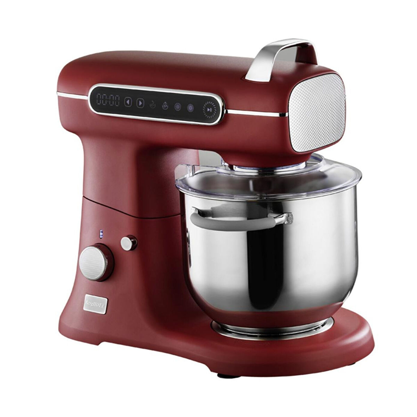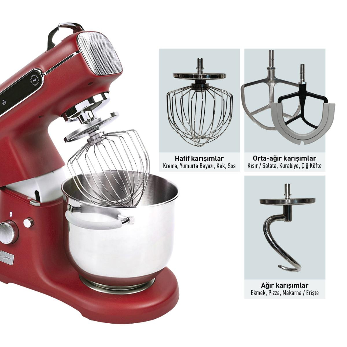 Berghoff 1500W Sessiz Stand Mikser - Kırmızı, 7 L Geniş Hazne, Dokunmatik Ekranlı Berghoff’un dikkat çekici kırmızı rengiyle mutfağınıza enerji katın! 1500W gücündeki sessiz motoru sayesinde kek, pasta ve hamur işlerini kolayca hazırlayın. 7 litrelik kulplu paslanmaz çelik haznesi geniş hacmiyle büyük porsiyonlar için idealdir. 11 kademeli hız ayarı ve Turbo modu sayesinde tam kıvamında karışımlar elde edersiniz. Dijital dokunmatik ekranıyla kullanım son derece kolay. Sessiz çalışma (70 dB), dayanıklı metal dişliler ve aşırı ısınma koruması ile uzun ömürlü ve güvenli. Öne Çıkan Özellikler: Berghoff 1500W güçlü ve sessiz DC motor 7L paslanmaz çelik hazne (kulplu) 11 hız seviyesi + Turbo fonksiyonu Dokunmatik ekran ile kolay kullanım Sessiz çalışma (70 dB), sağlam metal dişliler 24 saat aralıksız çalışma desteği Aşırı ısınma ve yük koruması (PTC) Ürün Ölçüleri: ? Genişlik: 25 cm ? Yükseklik: 41 cm ? Derinlik: 45 cm Ağırlık: 15.5 kg ? Renk: Kırmızı ? 2 Yıl Berghoff garantisi