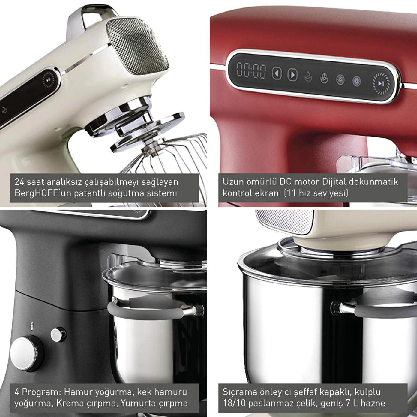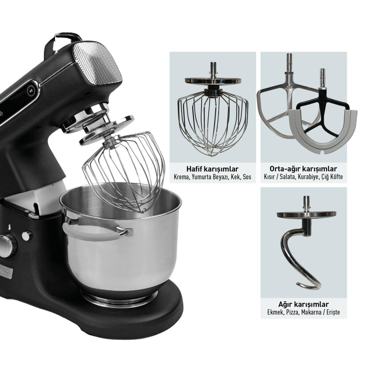 Yüksek performanslı, uzun ömürlü ve sessiz DC motorDayanıklı döküm alüminyum gövdeKulplu 18/10 paslanmaz çelik, geniş 7 L hazne Dijital dokunmatik kontrol ekranı (11 hız seviyesi)Sessiz çalışma seviyesi: 70 dBGeliştirilmiş metal dişlilerle sabit kullanım garantisiSabit kullanımı garantileyen geliştirilmiş metal dişlileri 4 Program :Hamur yoğurma, kek hamuru yoğurma, Krema çırpma, Yumurta çırpmaDahili aksesuarlar: