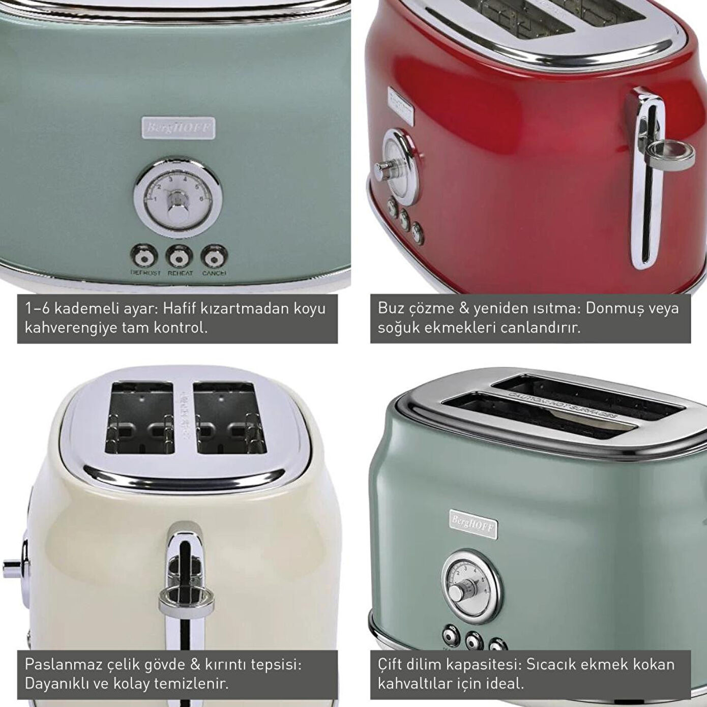 Berghoff Gem Retro 2 Dilim Ekmek Kızartma Makinesi – 815 W, Paslanmaz Çelik Gövde | Mint Yeşil