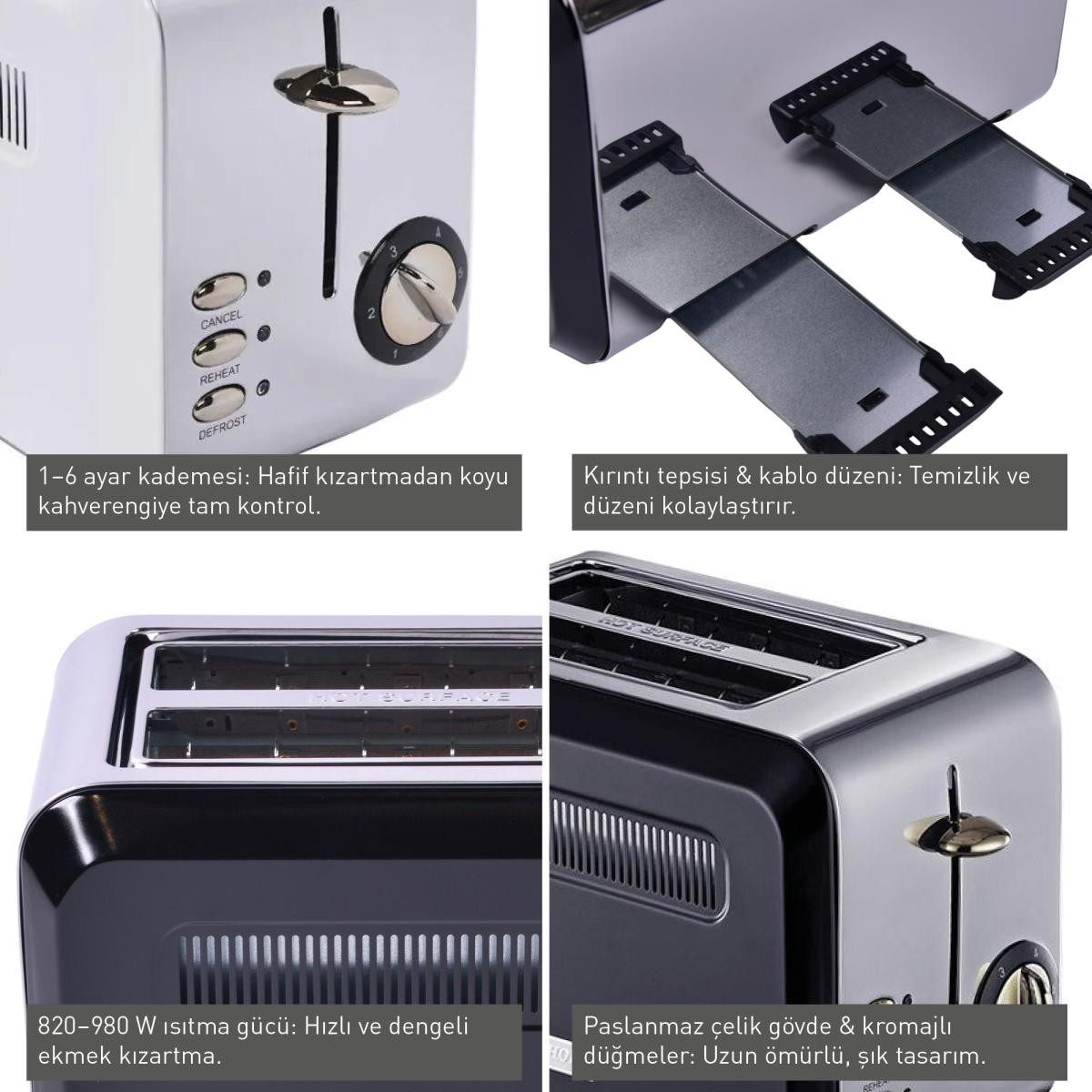 1640–1960 W güçlü ısıtma: Hızlı ve dengeli kızartma. 4 dilim kapasitesi: Kalabalık kahvaltılar için ideal. Buz çözme, yeniden ısıtma & iptal: Çok yönlü kullanım esnekliği. 1–6 ayar kademesi: Her dilimi tam istediğiniz kızarıklıkta hazırlayın. Bağımsız kontrol panelleri: İki bölgeyi ayrı ayrı yönetme imkânı.Teknik Özellikleri: