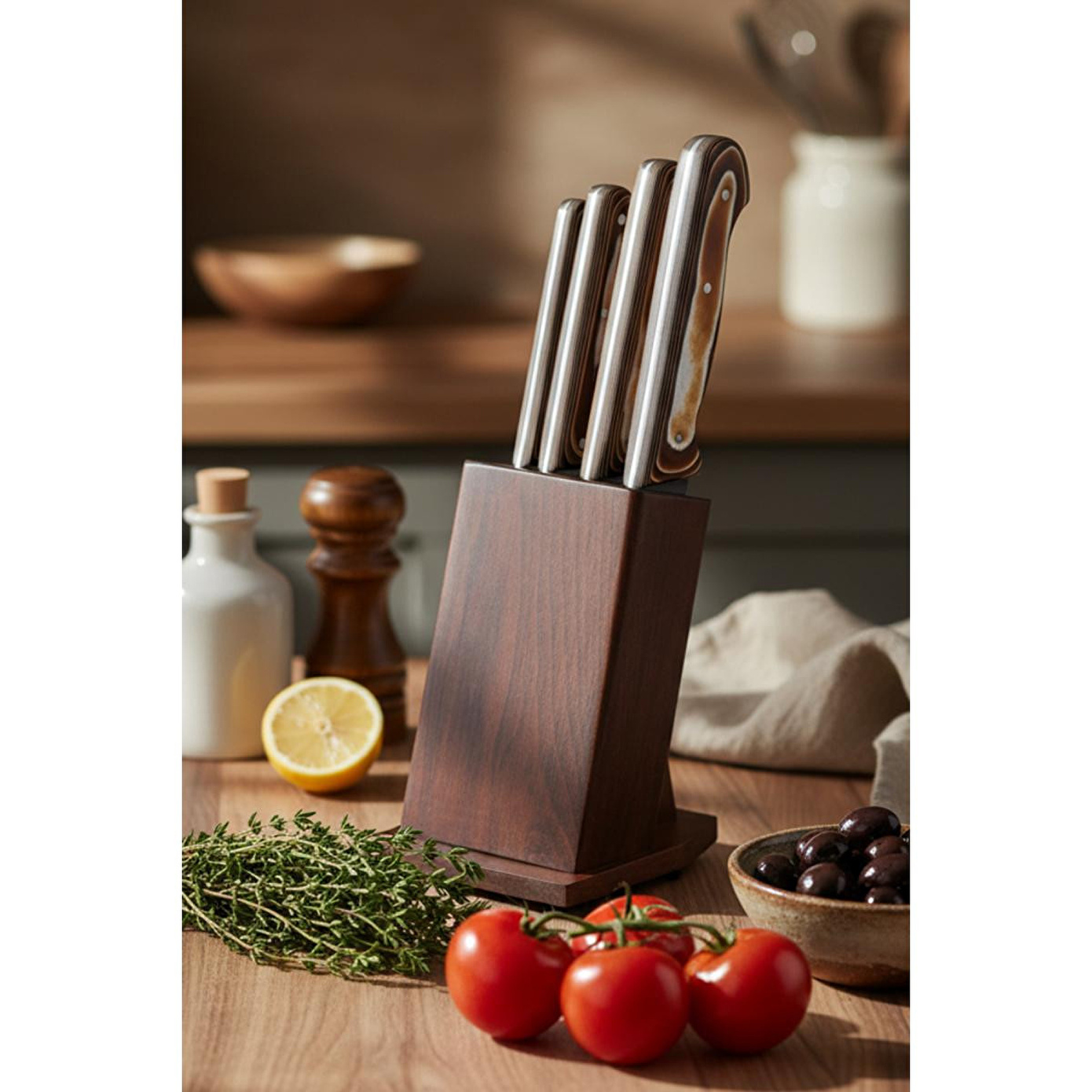 Ürünün Dış GörünümüŞık ve modern tasarımlı, ahşap takoz ile birlikte sunulmaktadır. Bıçakların sapları ergonomik ve estetik bir görünüme sahiptir.