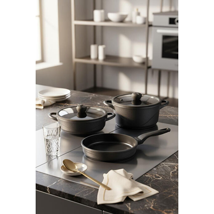 24 cm derin tencere + kapak26 cm basık tencere + kapak26 cm tavaFonksiyonları Yemek pişirme Kızartma Haşlama Kaynatma Isıtma Avantajları Isıyı eşit dağıtarak yemeklerin daha lezzetli pişmesini sağlar. Yanmaz ve yapışmaz yüzeyi sayesinde kolay temizlenir. Şık ve modern tasarımıyla mutfağınıza estetik bir görünüm katar. Uzun ömürlü ve dayanıklıdır. Uygun fiyatlıdır. Kullanım Alanları Ev mutfakları Restoranlar Kafeler Kullanım Amacı