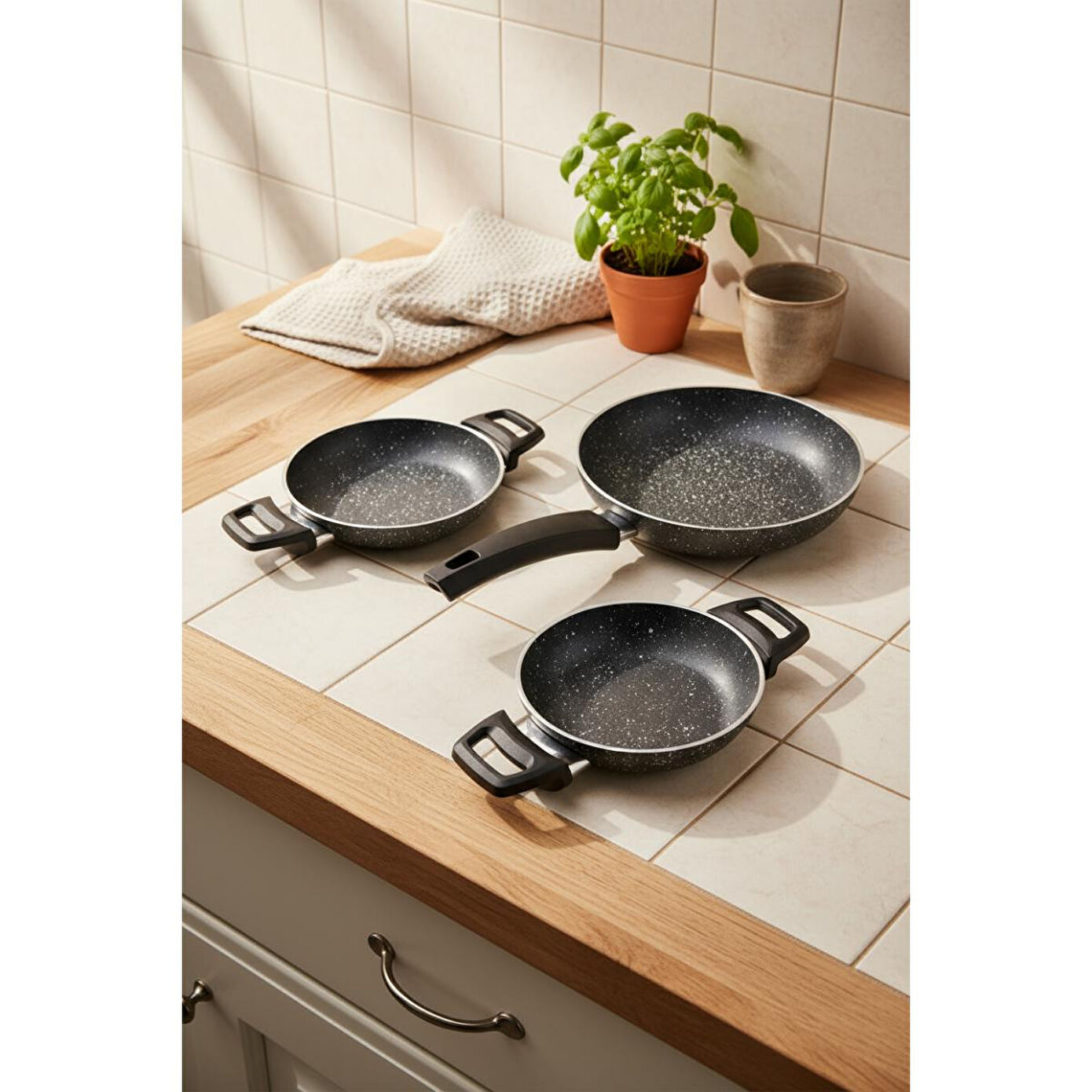 İlk kullanımdan önce sıcak su ve deterjanla yıkayıp kurulayın. Kullanım sırasında keskin metal mutfak aletleri kullanmaktan kaçının. Silikon veya tahta spatula tercih edin. Yüksek ateşte uzun süre boş bırakmayın. Temizlik için bulaşık makinesi yerine elde yıkama önerilir.Bernardo Athelas 3 parça tava ve sahan seti, hem günlük kullanım hem de özel yemekler için ideal bir seçimdir. Granit iç yüzeyi sayesinde yapışmazlık özelliği uzun süre korunur ve yemekleriniz lezzetli bir şekilde pişer. Siyah rengi ve modern tasarımı ile mutfaklarınıza şıklık katar. İndüksiyon tabanı sayesinde her türlü ocakta kullanıma uygundur. Bu set, mutfakta geçirdiğiniz zamanı daha keyifli ve verimli hale getirecek.