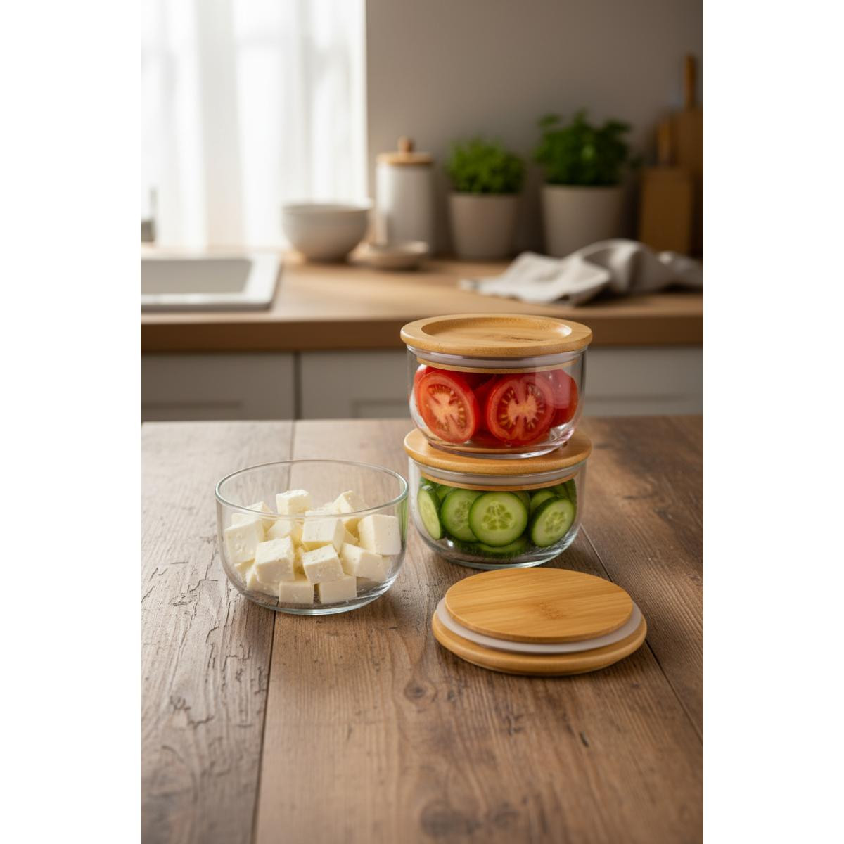 Ürünün Sağlığa FaydalarıCam malzeme, gıdalarla etkileşime girmez ve zararlı kimyasallar içermez. Bambu kapak, doğal bir malzemedir.