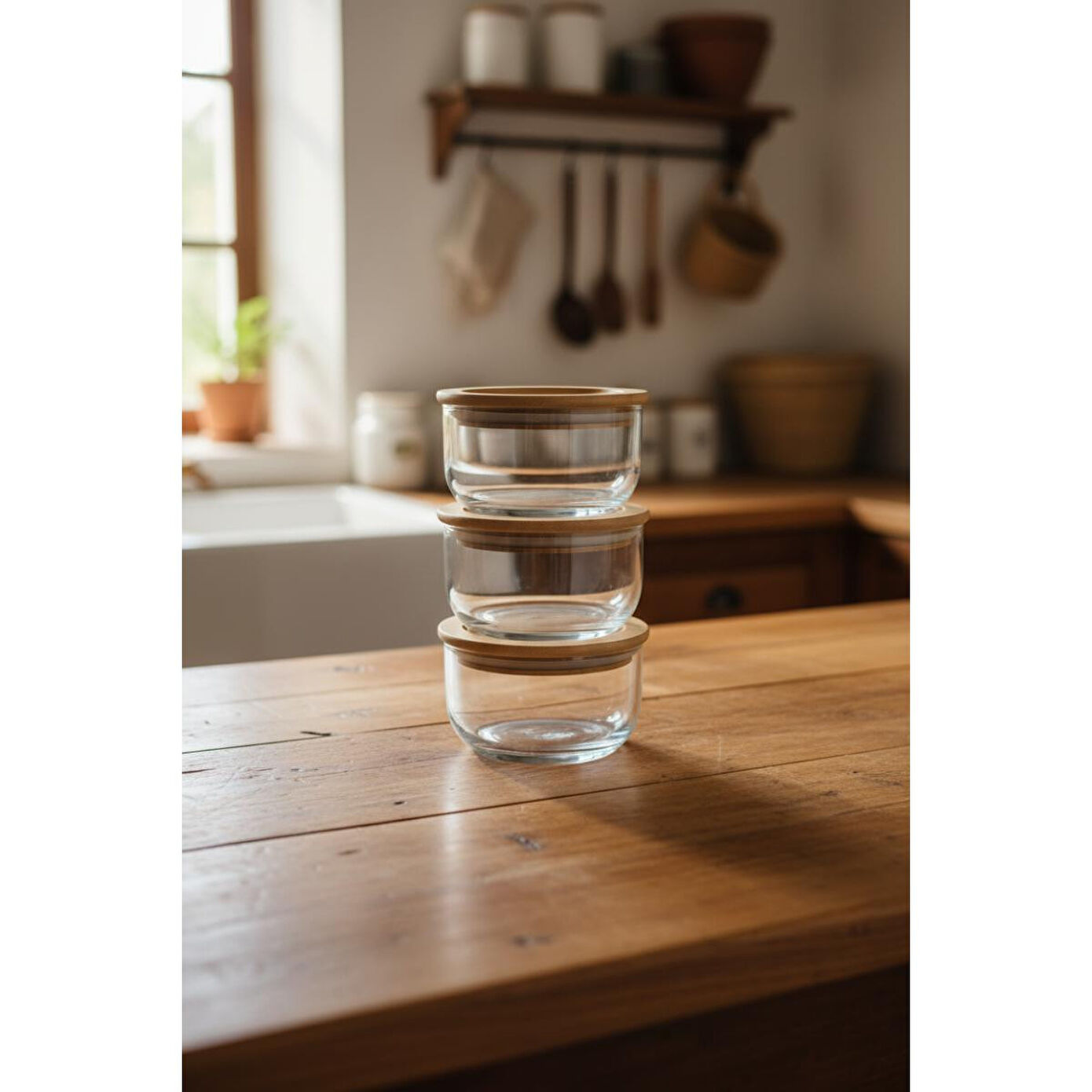 Ürünün Fonksiyonları Erzak saklama Baharat saklama Mutfak düzenleme Servis amaçlı kullanma (reçel, bal vb.) Ürünün Avantajları Şık Tasarım: Bambu kapaklı cam tasarımı mutfağınıza estetik bir görünüm katar. Hava Geçirmez Kapak: Bambu kapaklar, gıdalarınızın tazeliğini daha uzun süre korur. Kolay Temizlik: Cam malzeme kolayca temizlenir ve hijyeniktir. Çok Amaçlı Kullanım: Farklı gıdaları saklamak için idealdir. Dayanıklı Malzeme: Yüksek kaliteli cam ve bambu malzemeden üretilmiştir. Ürünün Kullanım Alanları Mutfak Kiler Yemek odası Ürünün Kullanım AmacıErzak, baharat, çay, kahve gibi kuru gıdaları düzenli ve hijyenik bir şekilde saklamak, mutfakta düzen sağlamak ve gıdaların tazeliğini korumak.
