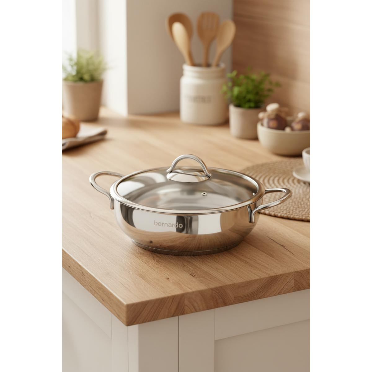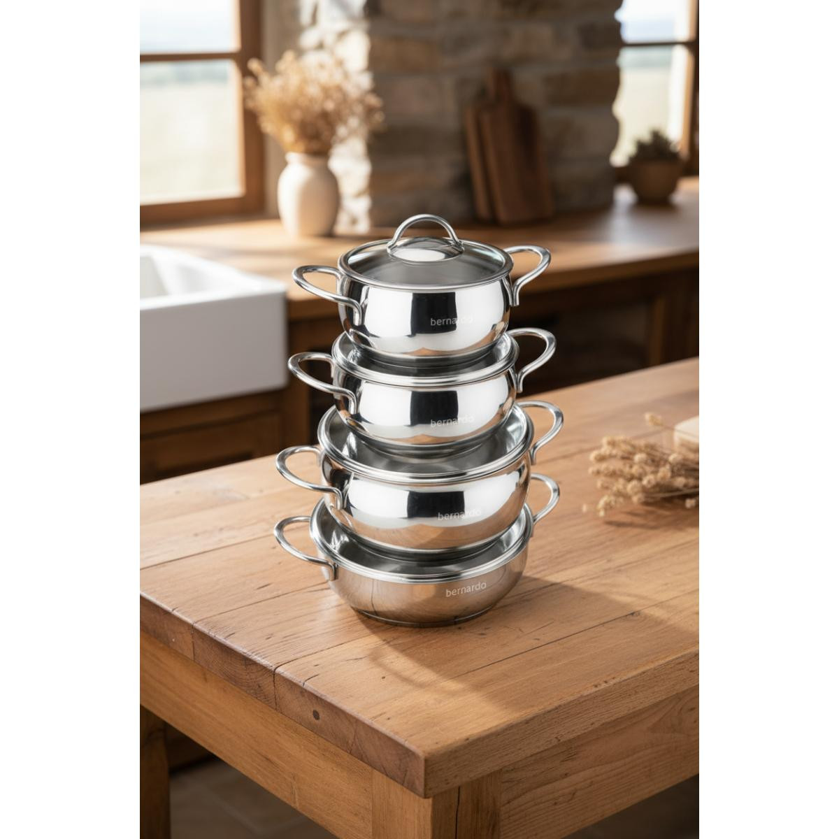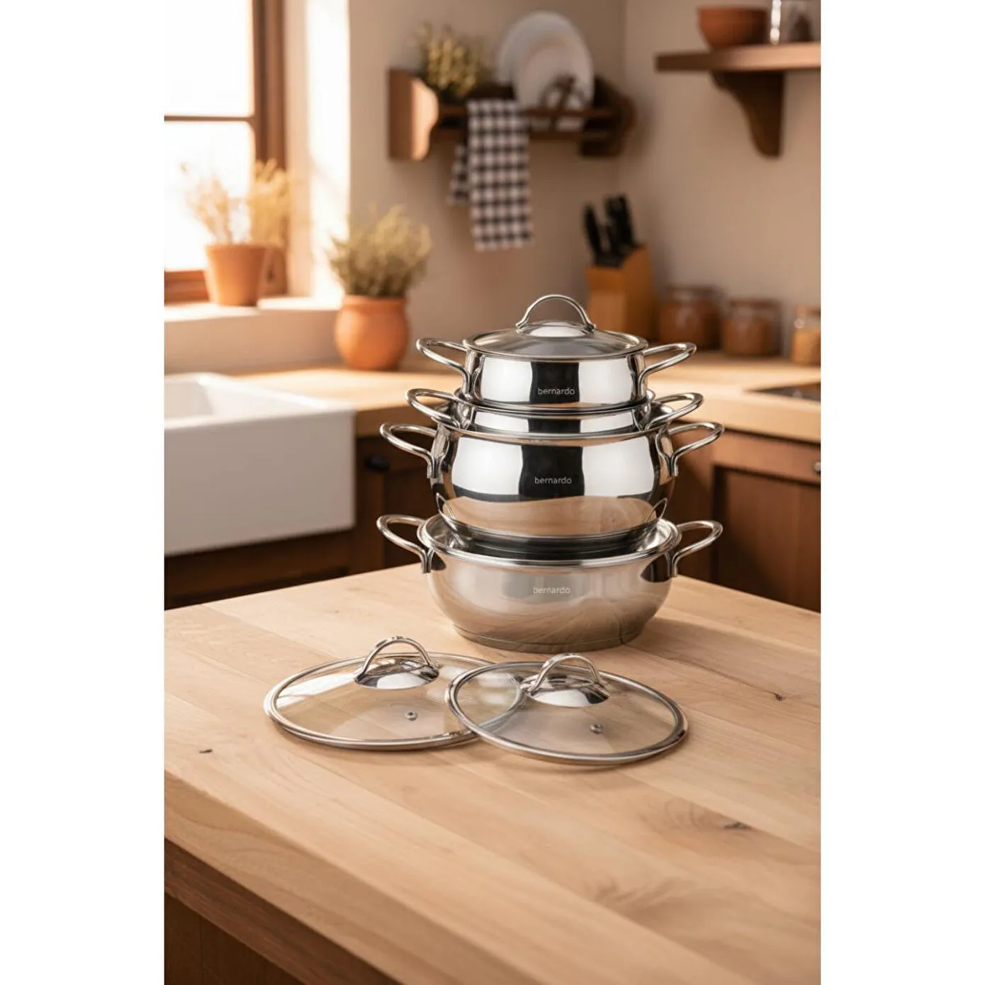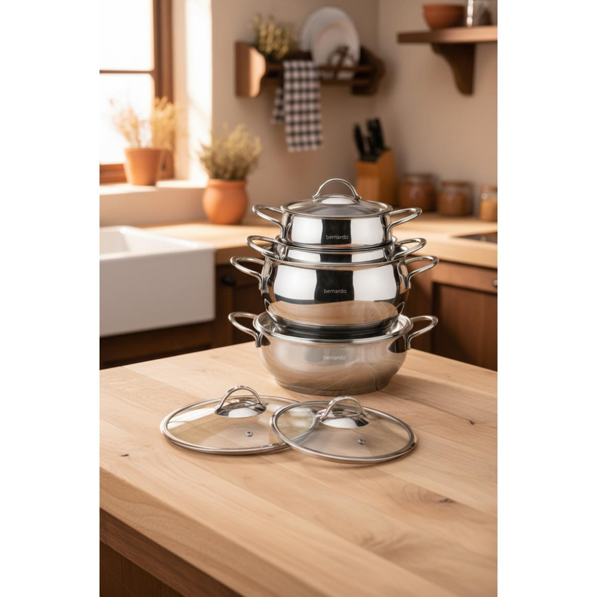 Dış GörünümüBernardo Monde Tencere Seti, parlak çelik yüzeyi ve modern tasarımıyla mutfağınıza şıklık katar. Cam kapakları sayesinde yemeklerin pişme sürecini kolayca takip edebilirsiniz.